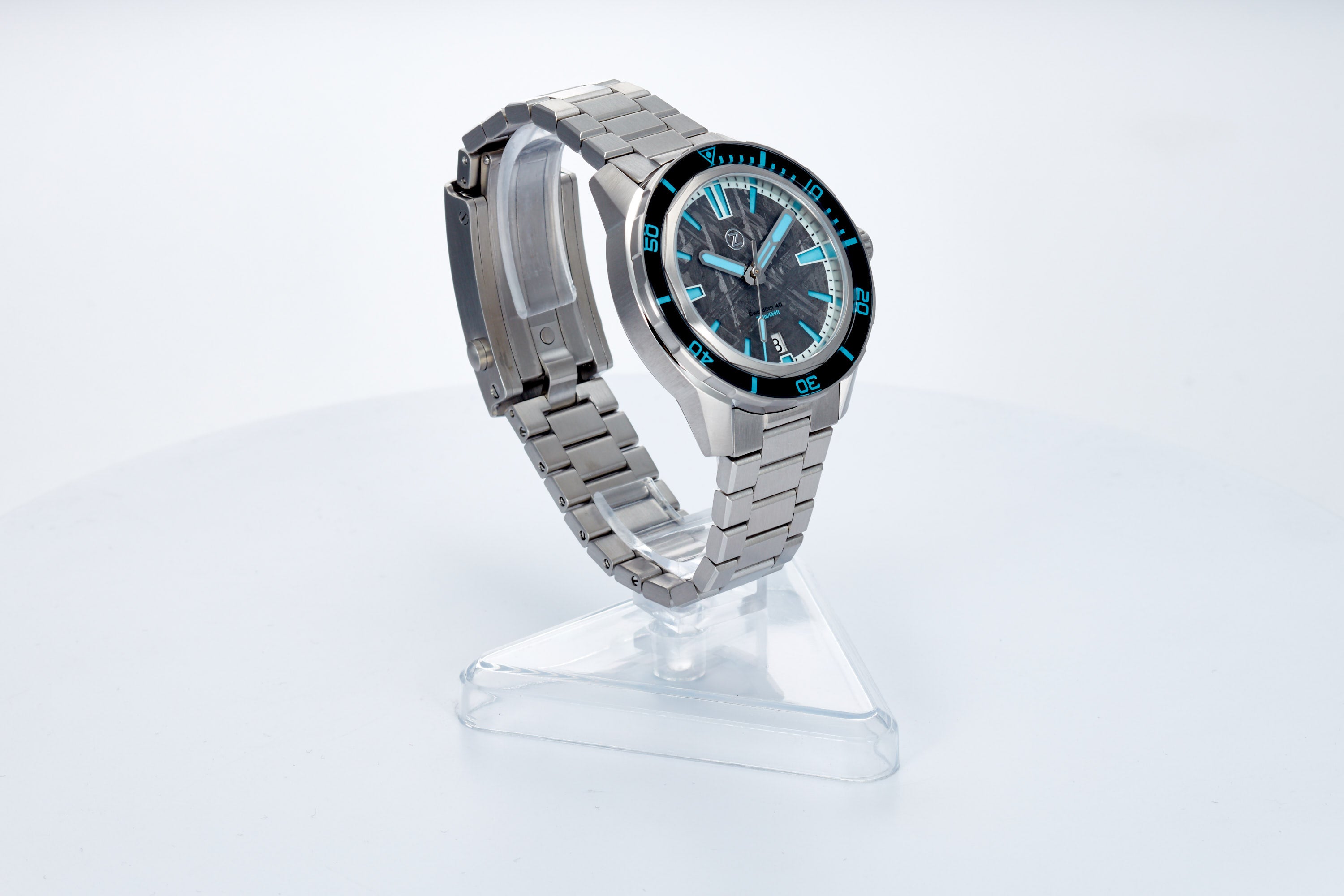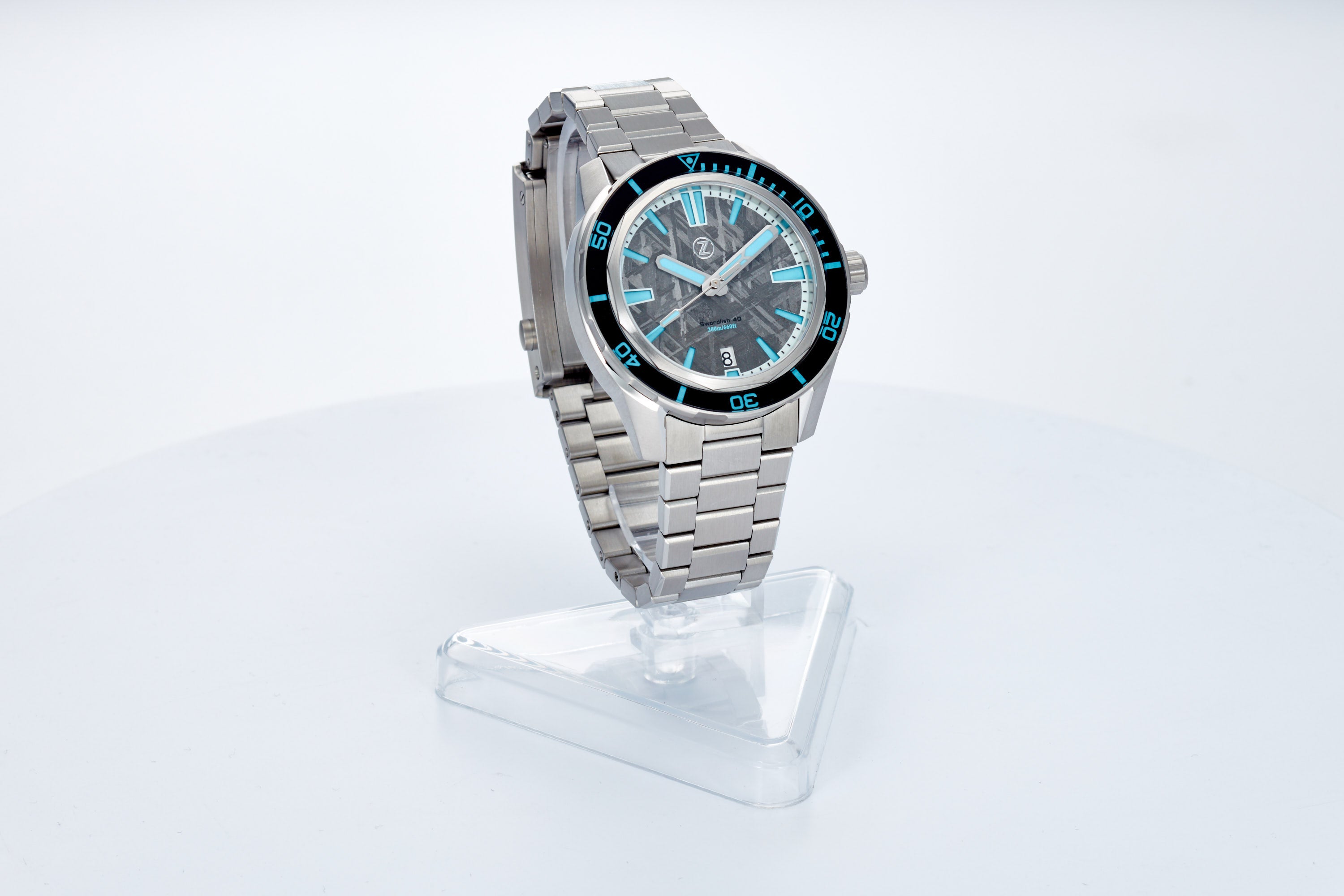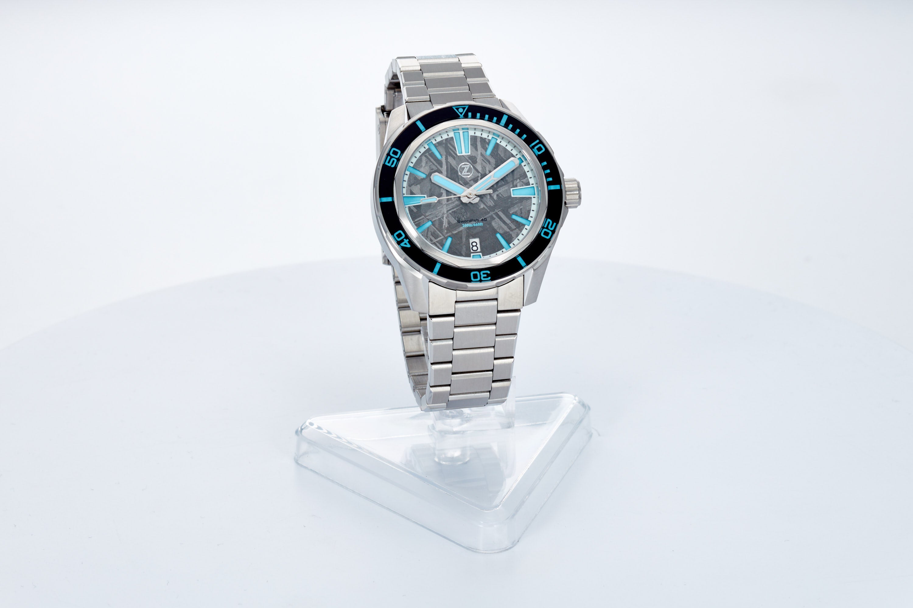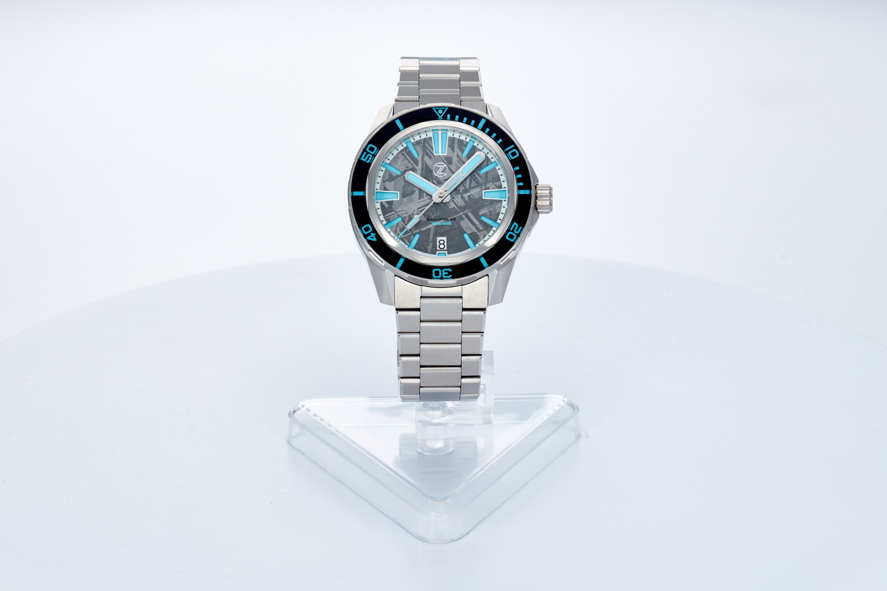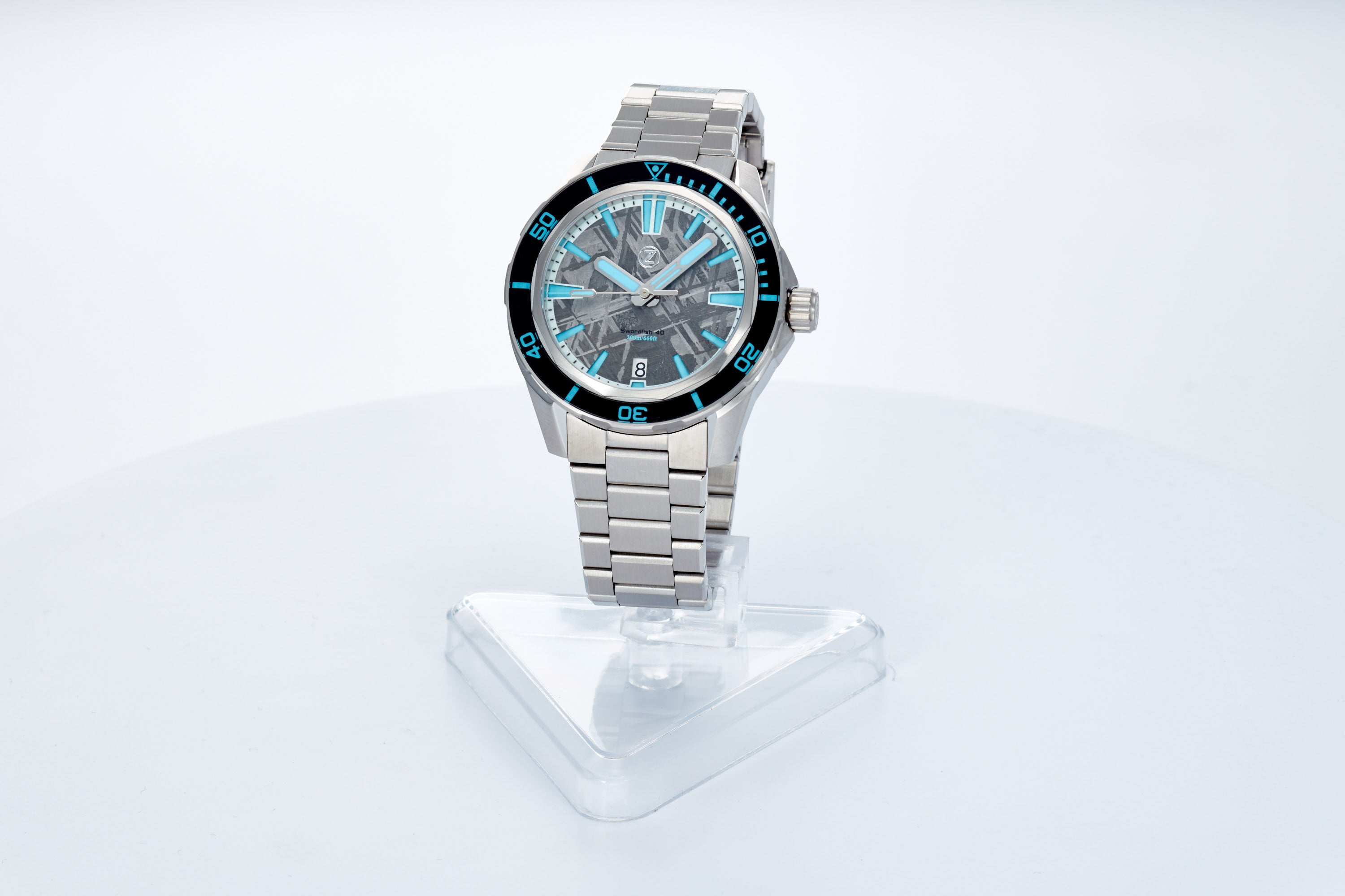 Meteorite dial and black sapphire bezel with light blue lumed hands and indices.