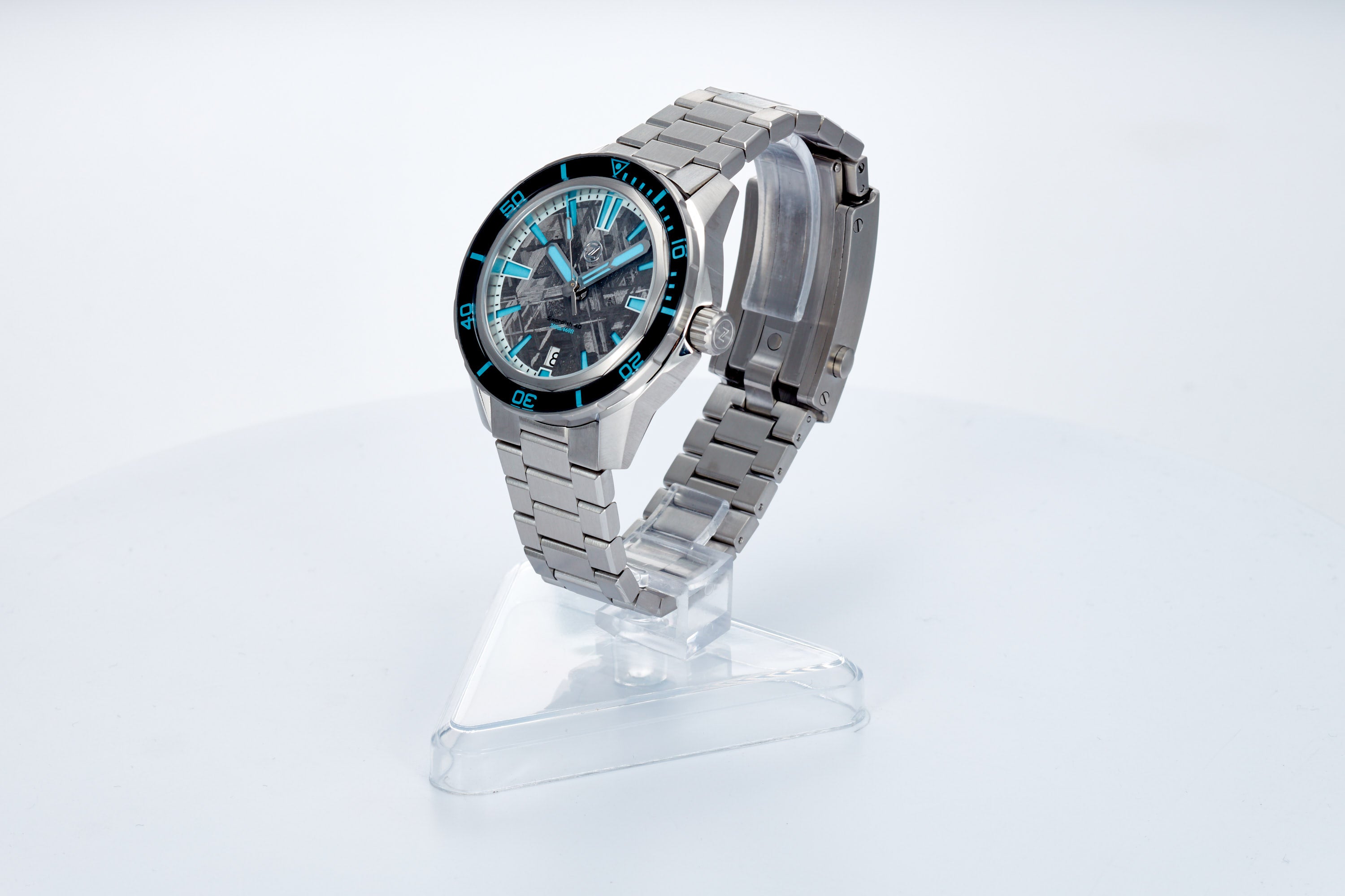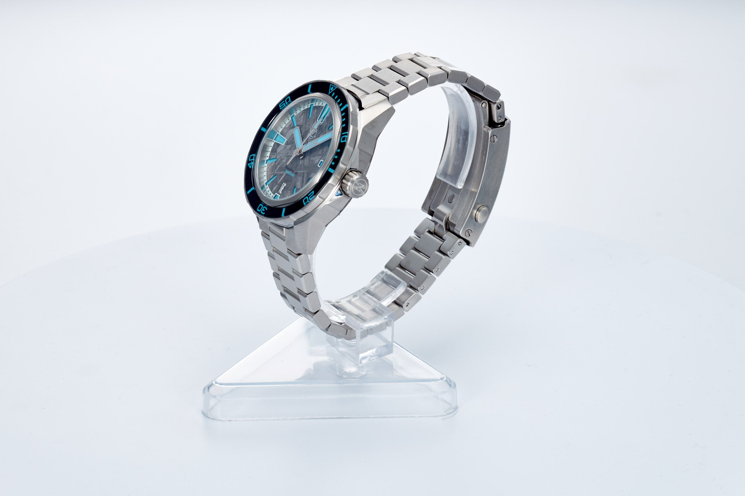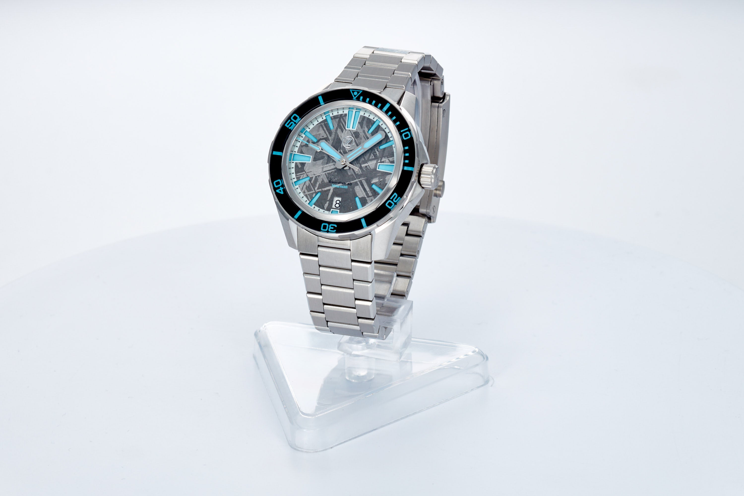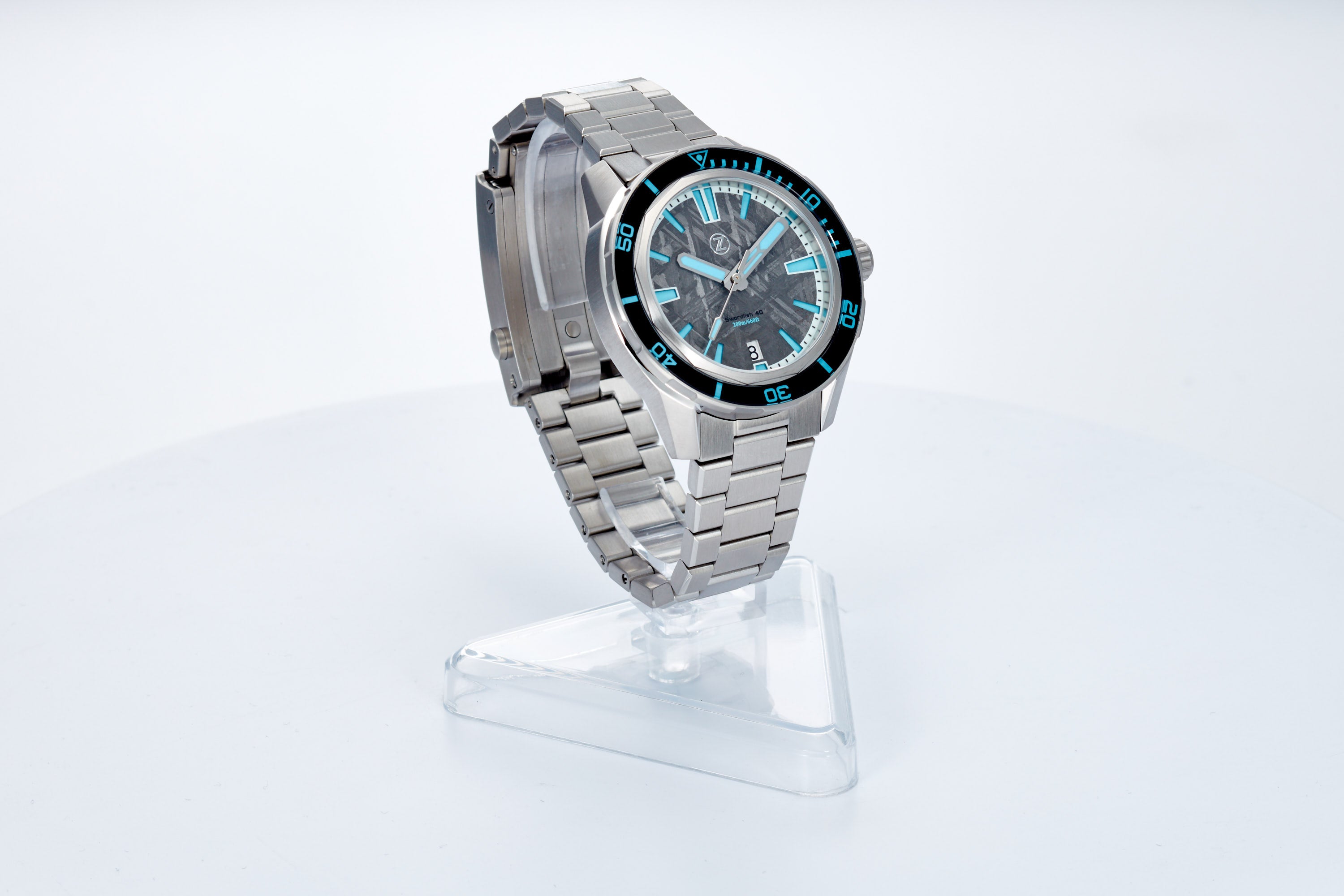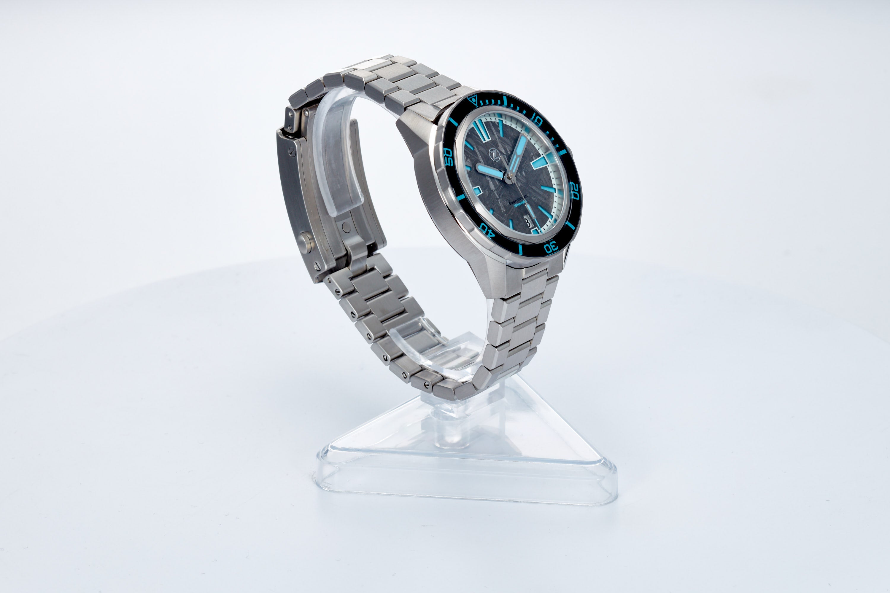 Meteorite dial and black sapphire bezel with light blue lumed hands and indices.
