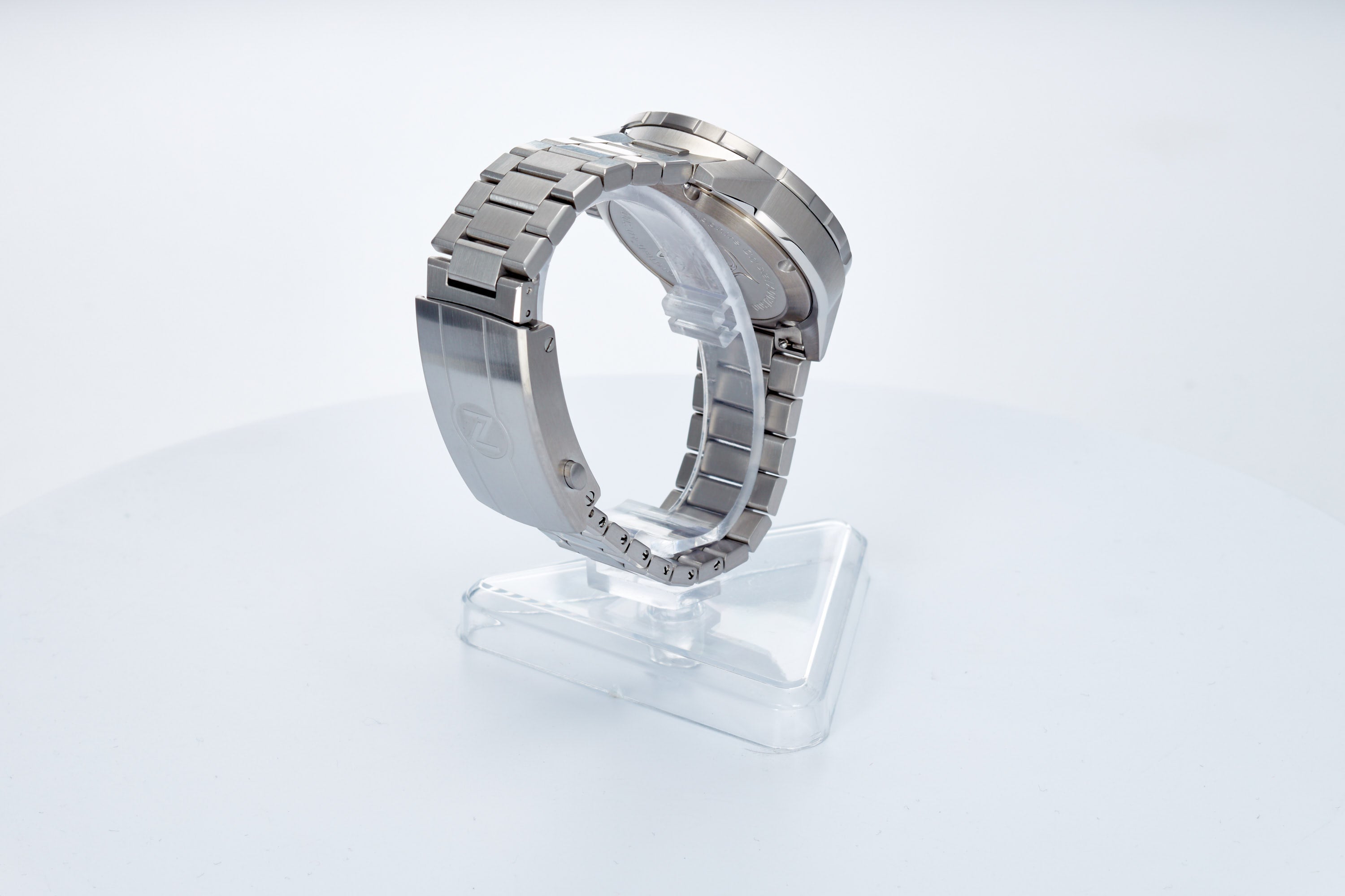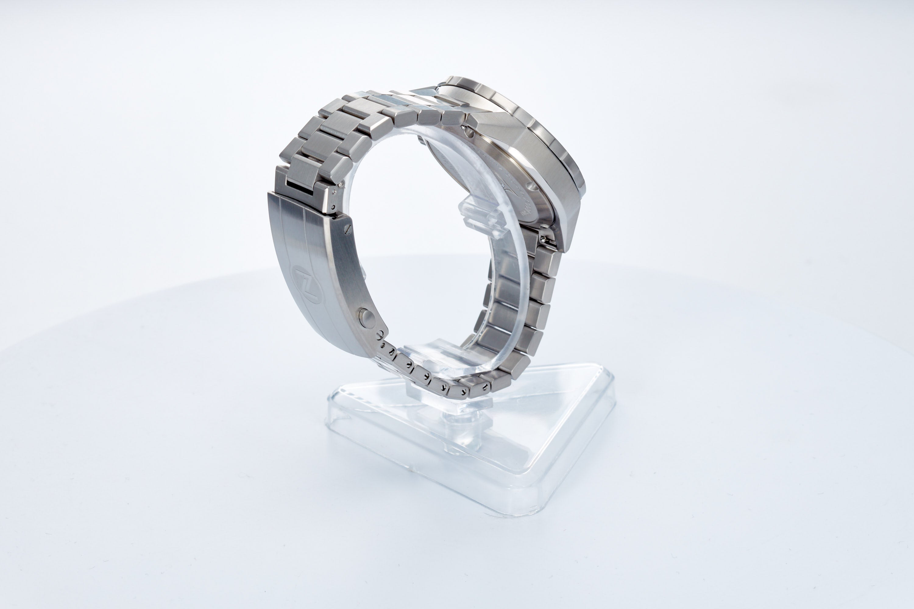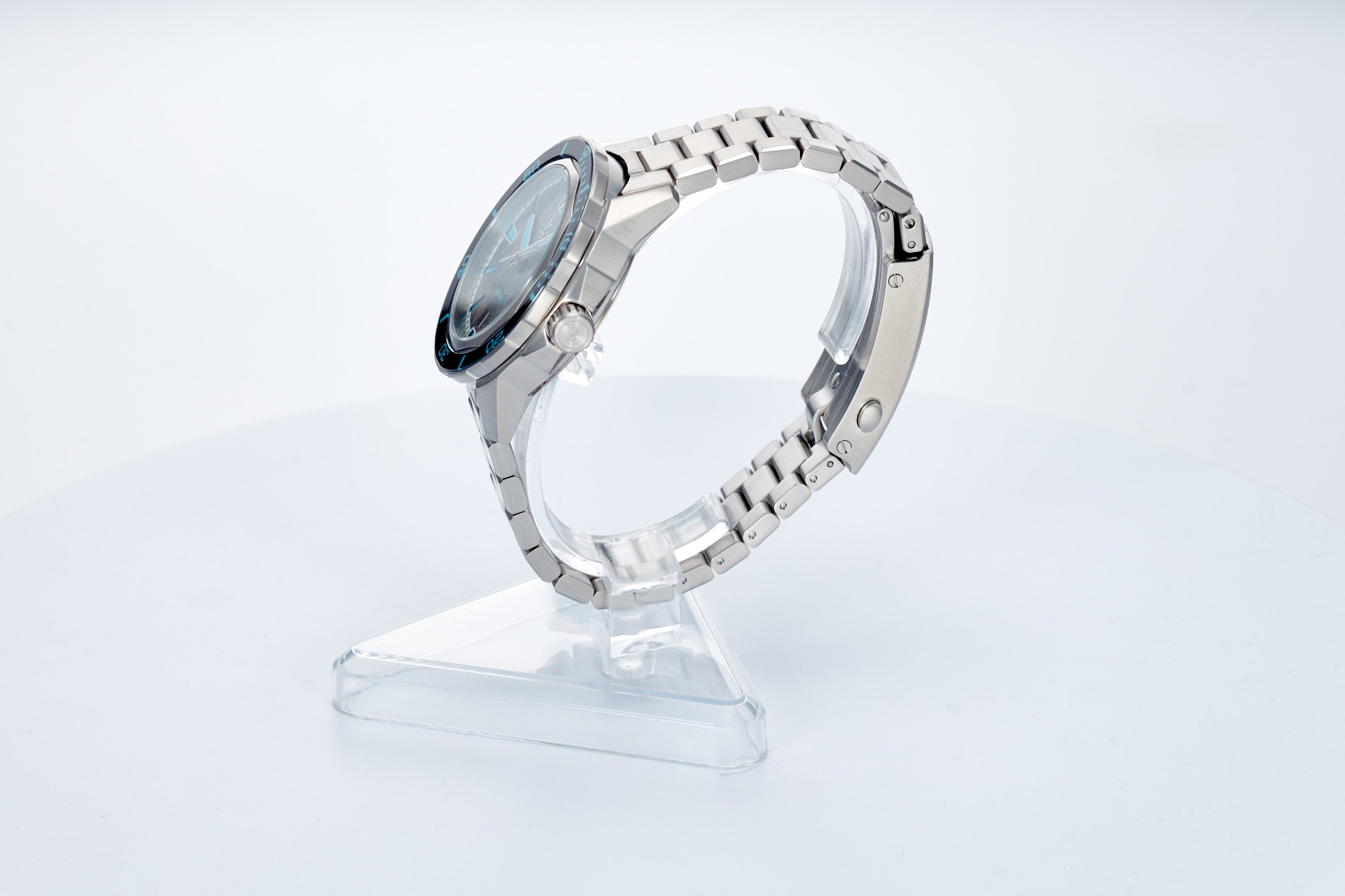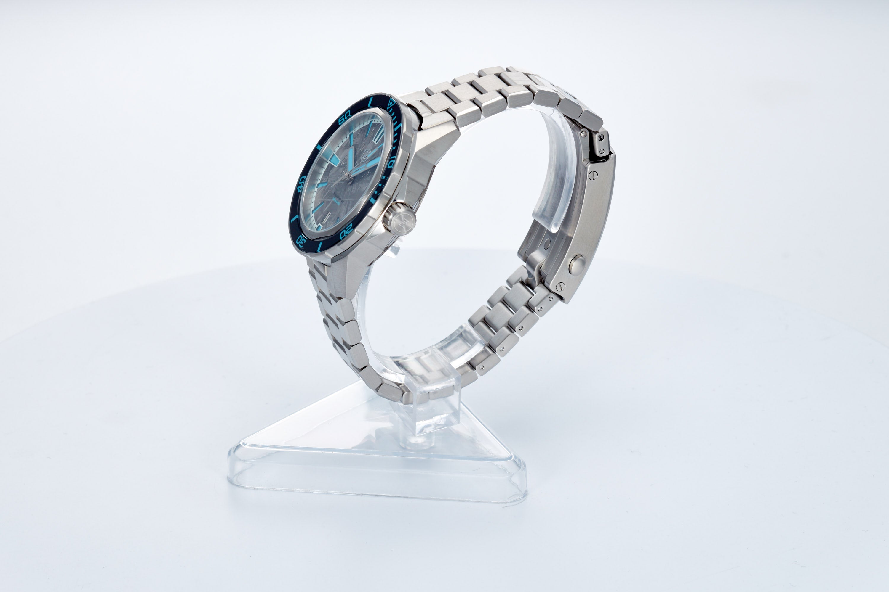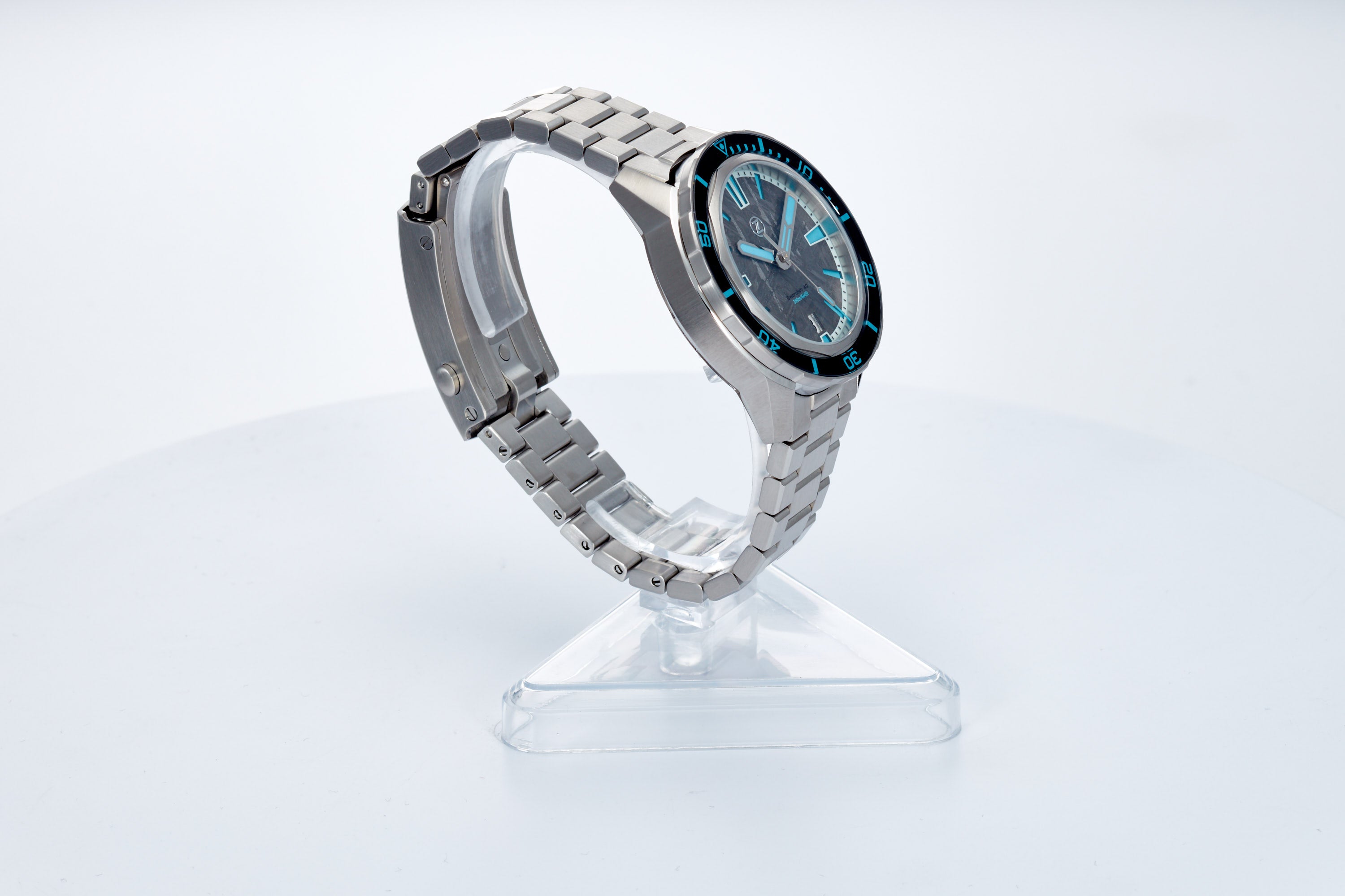 Meteorite dial and black sapphire bezel with light blue lumed hands and indices.