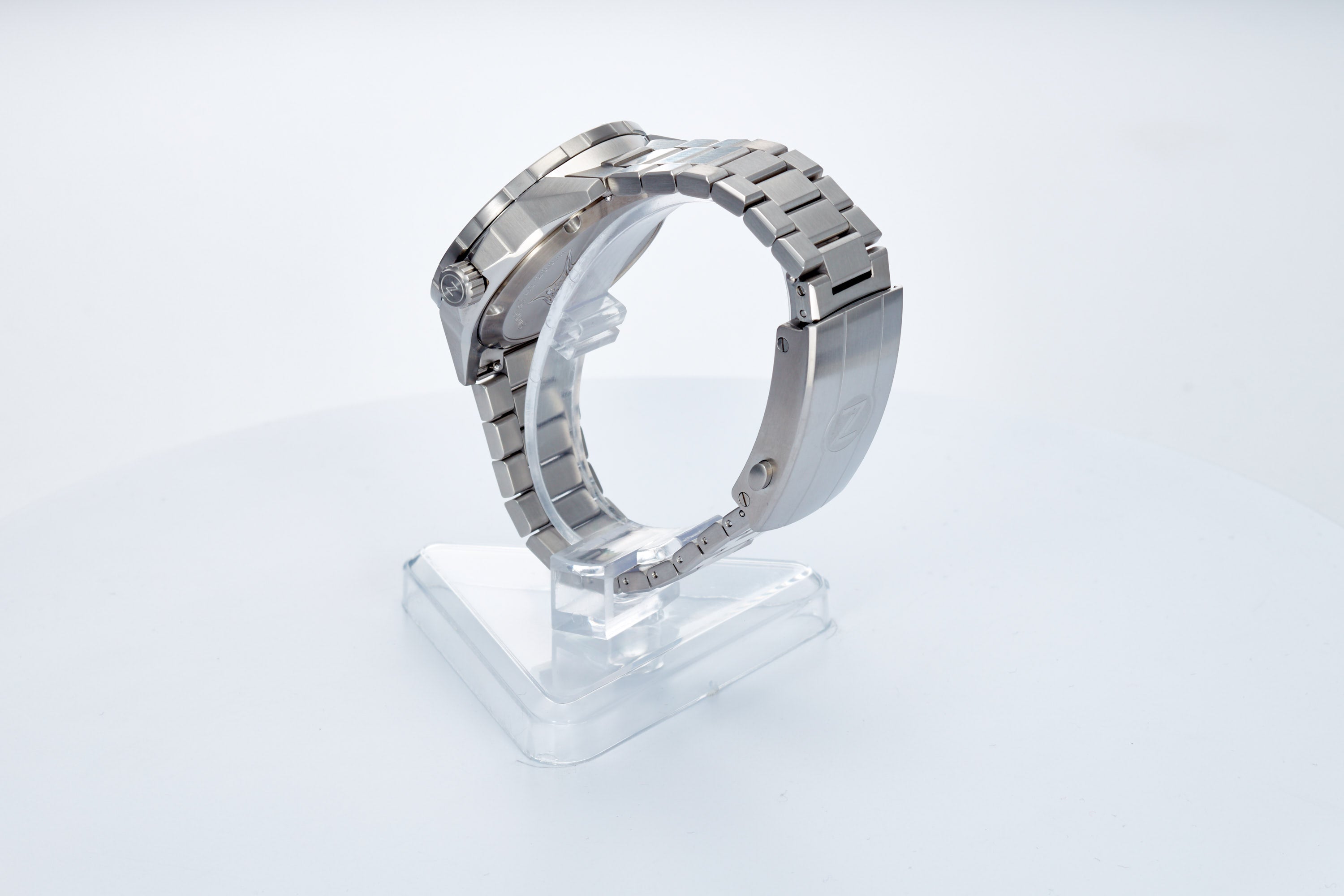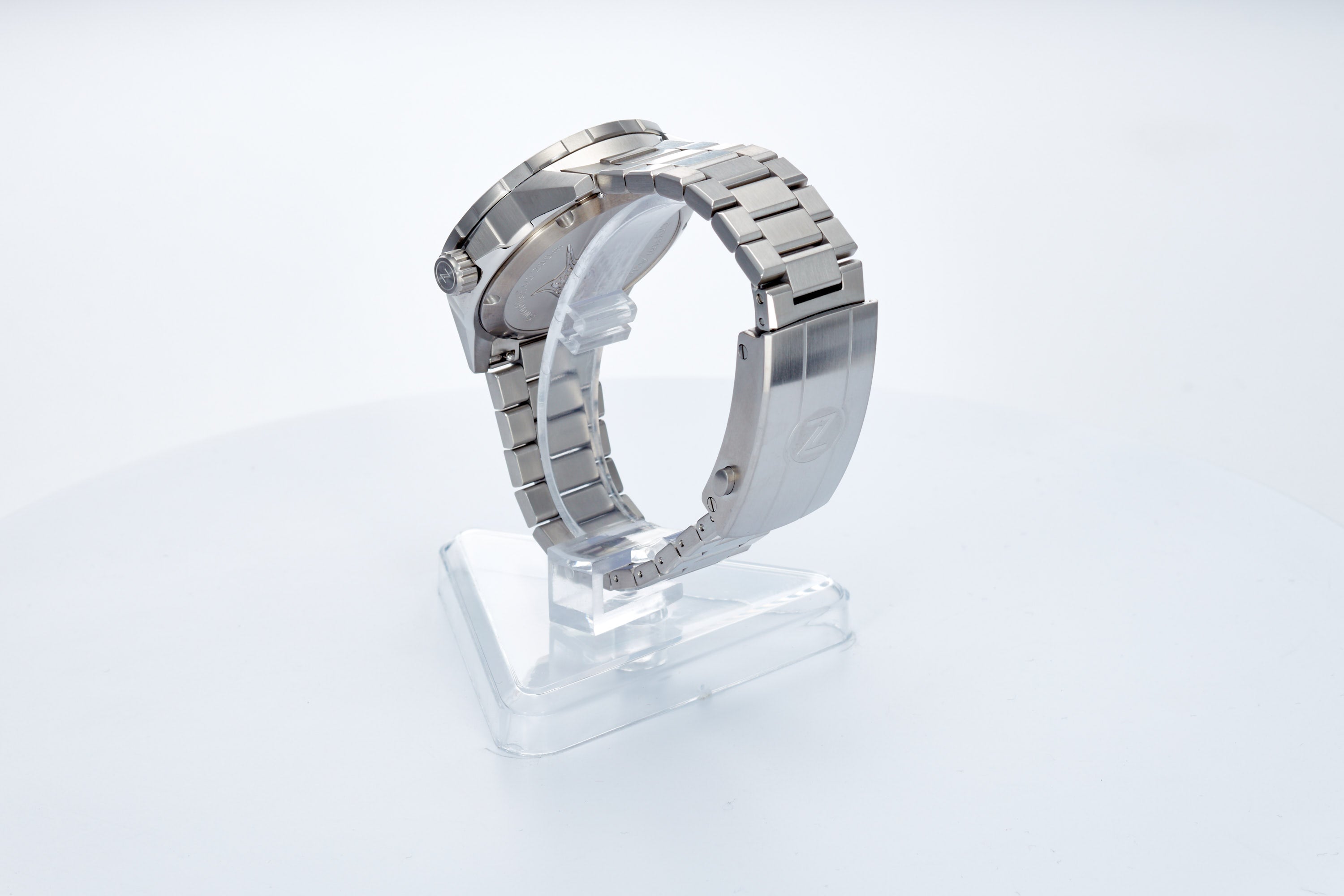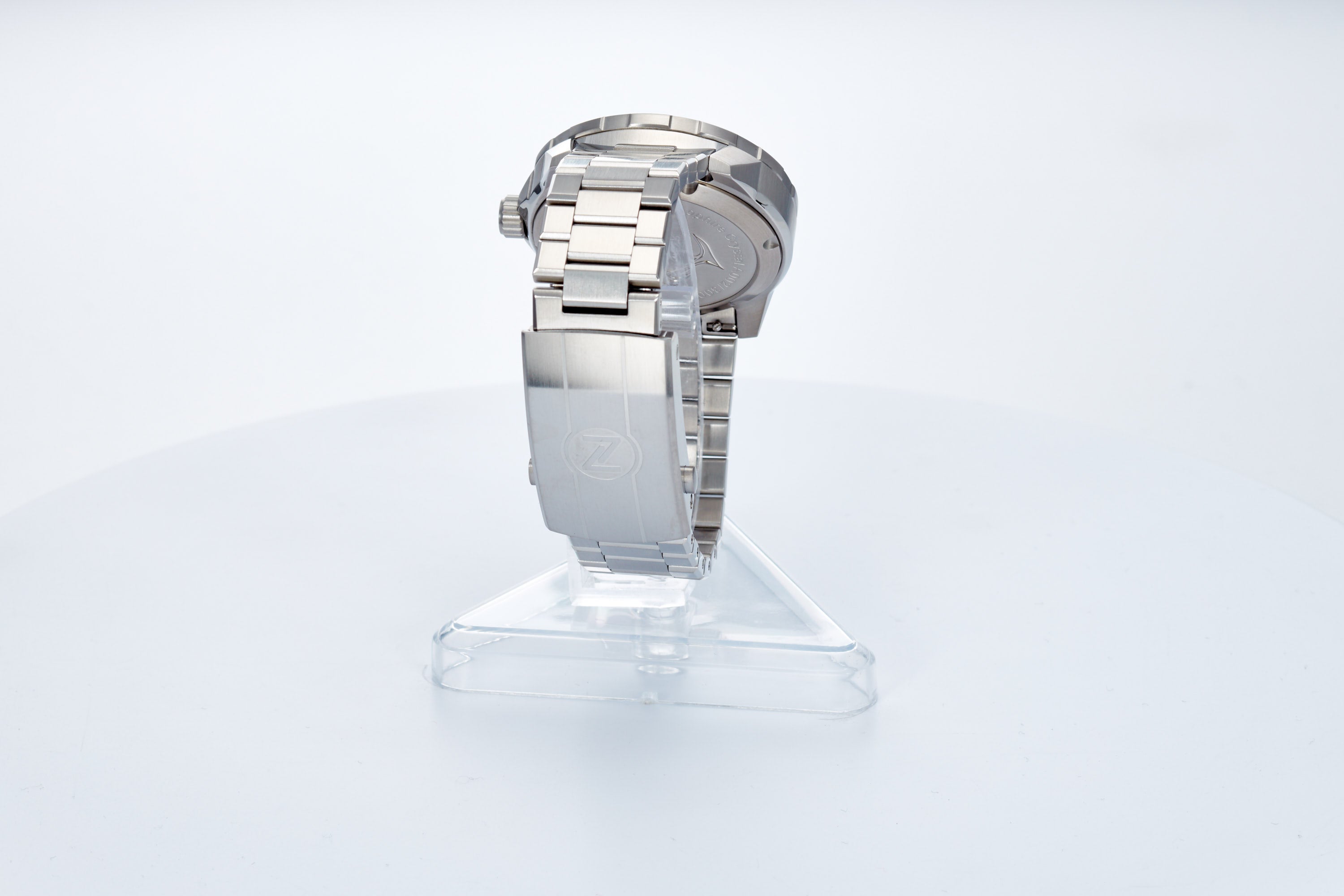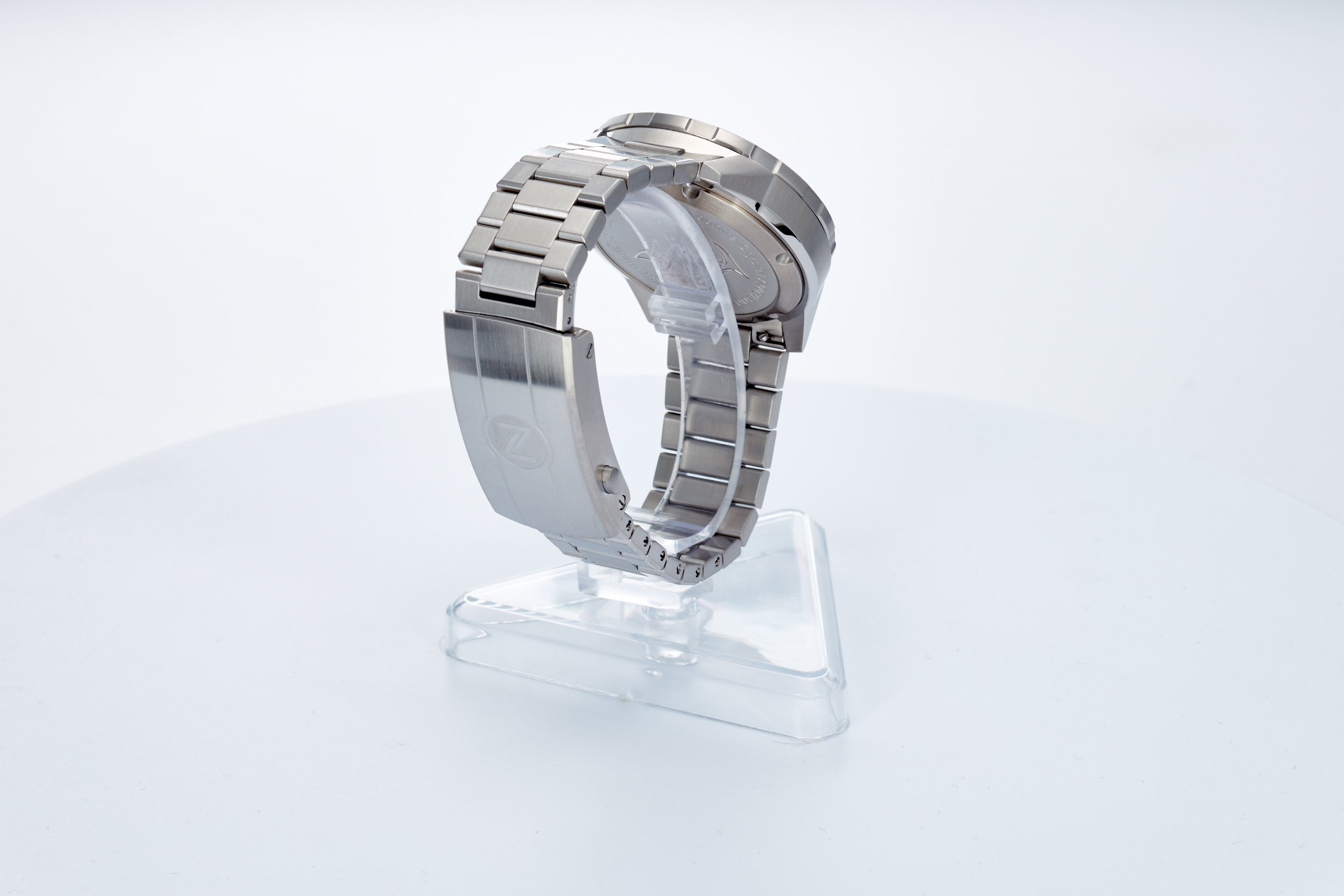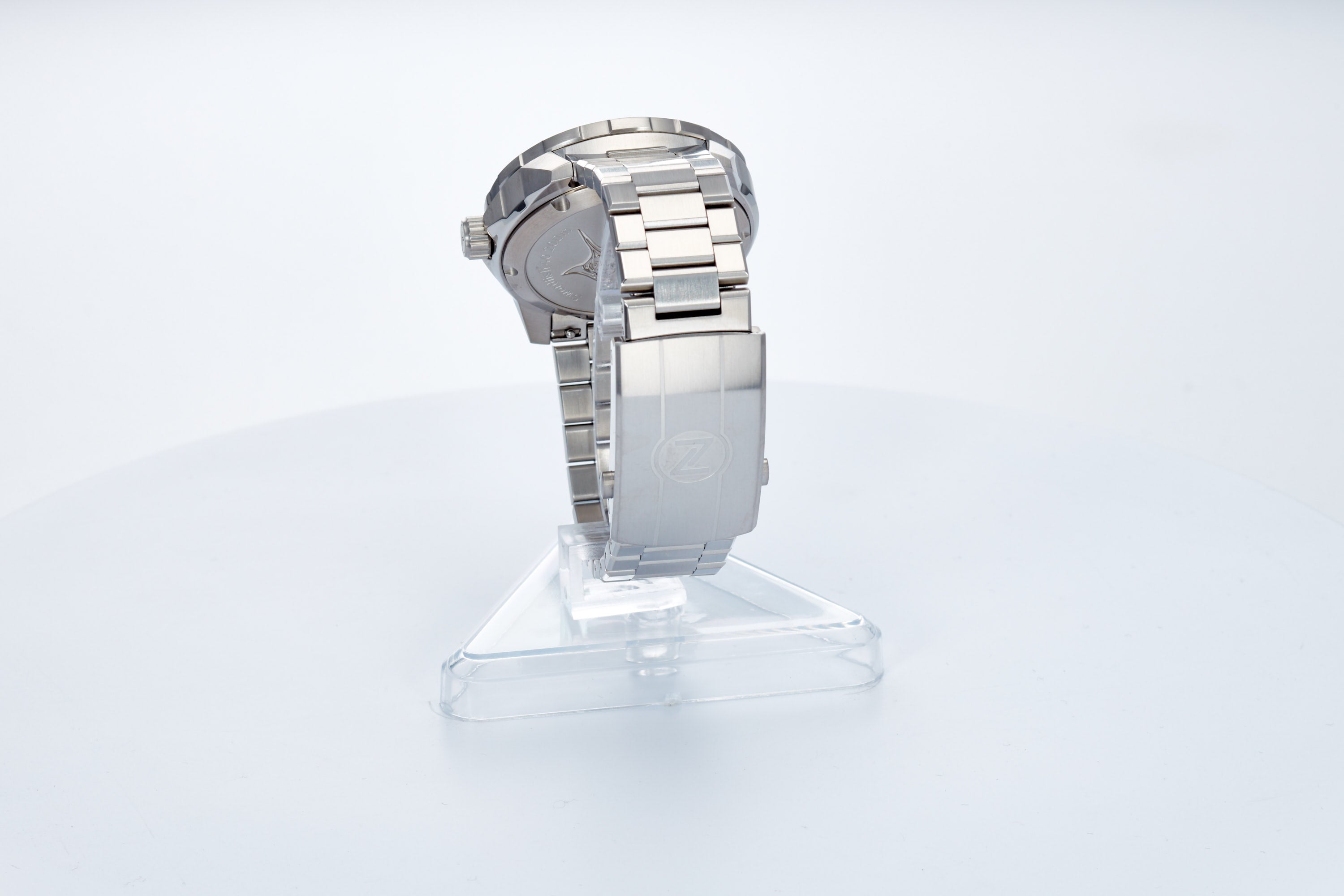 Meteorite dial and black sapphire bezel with light blue lumed hands and indices.