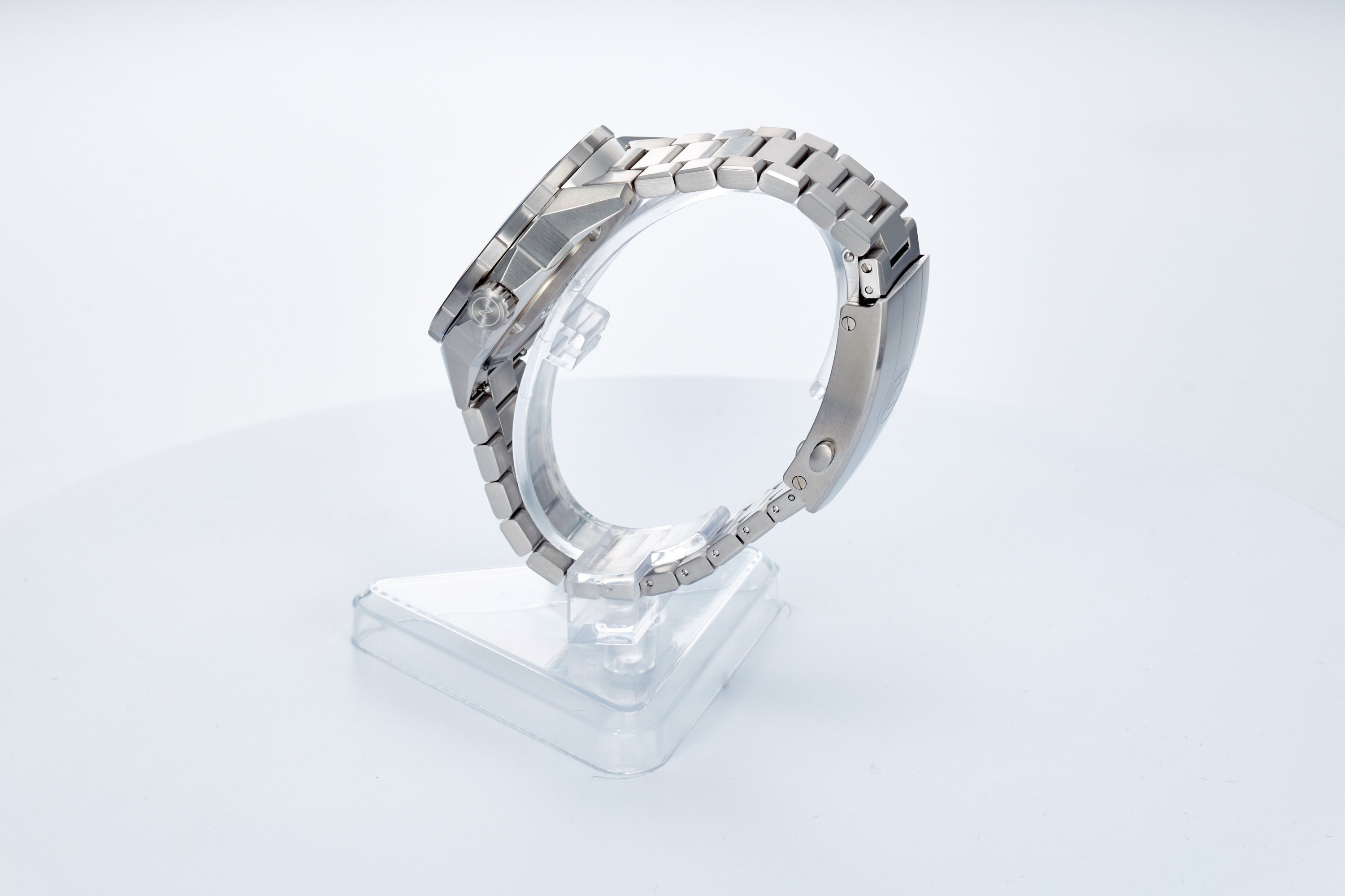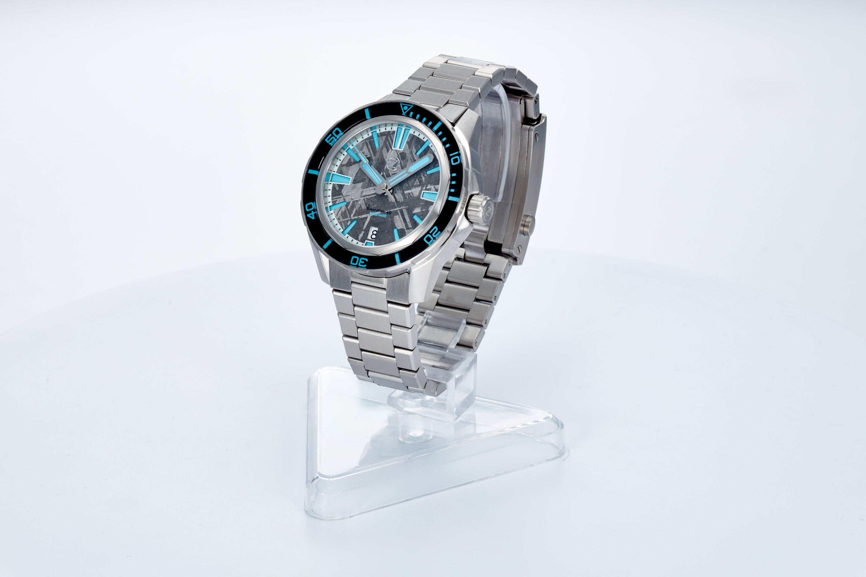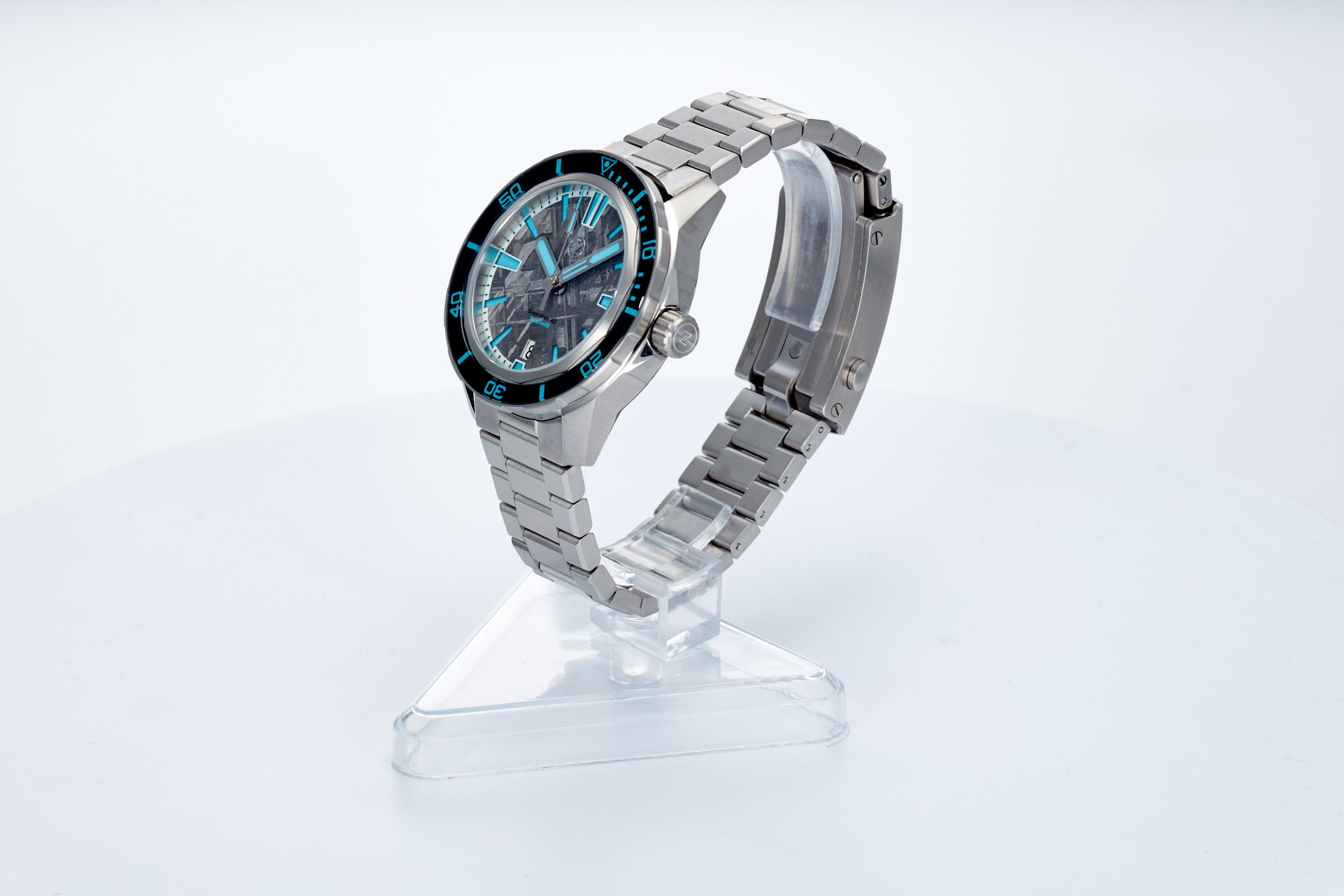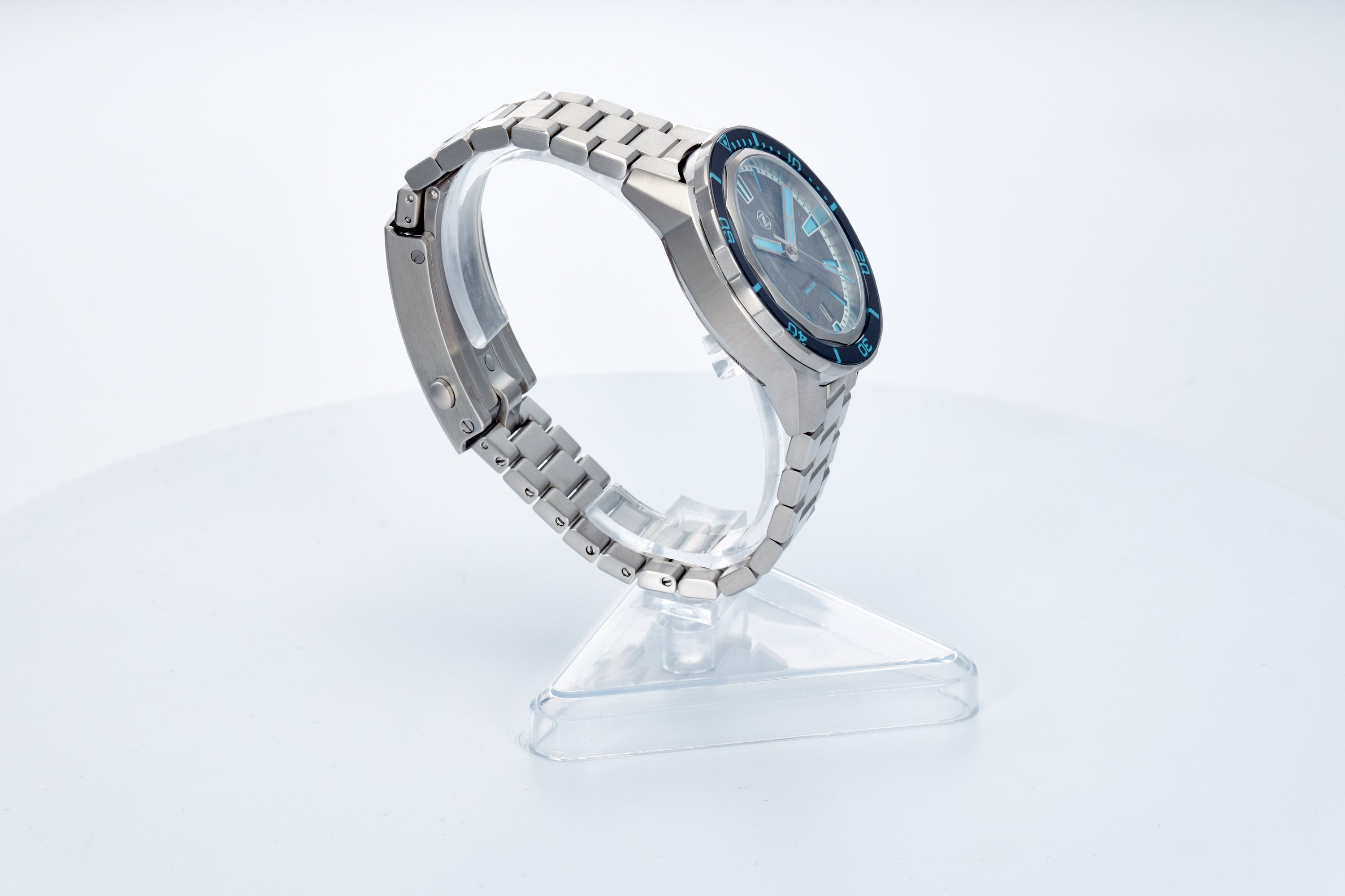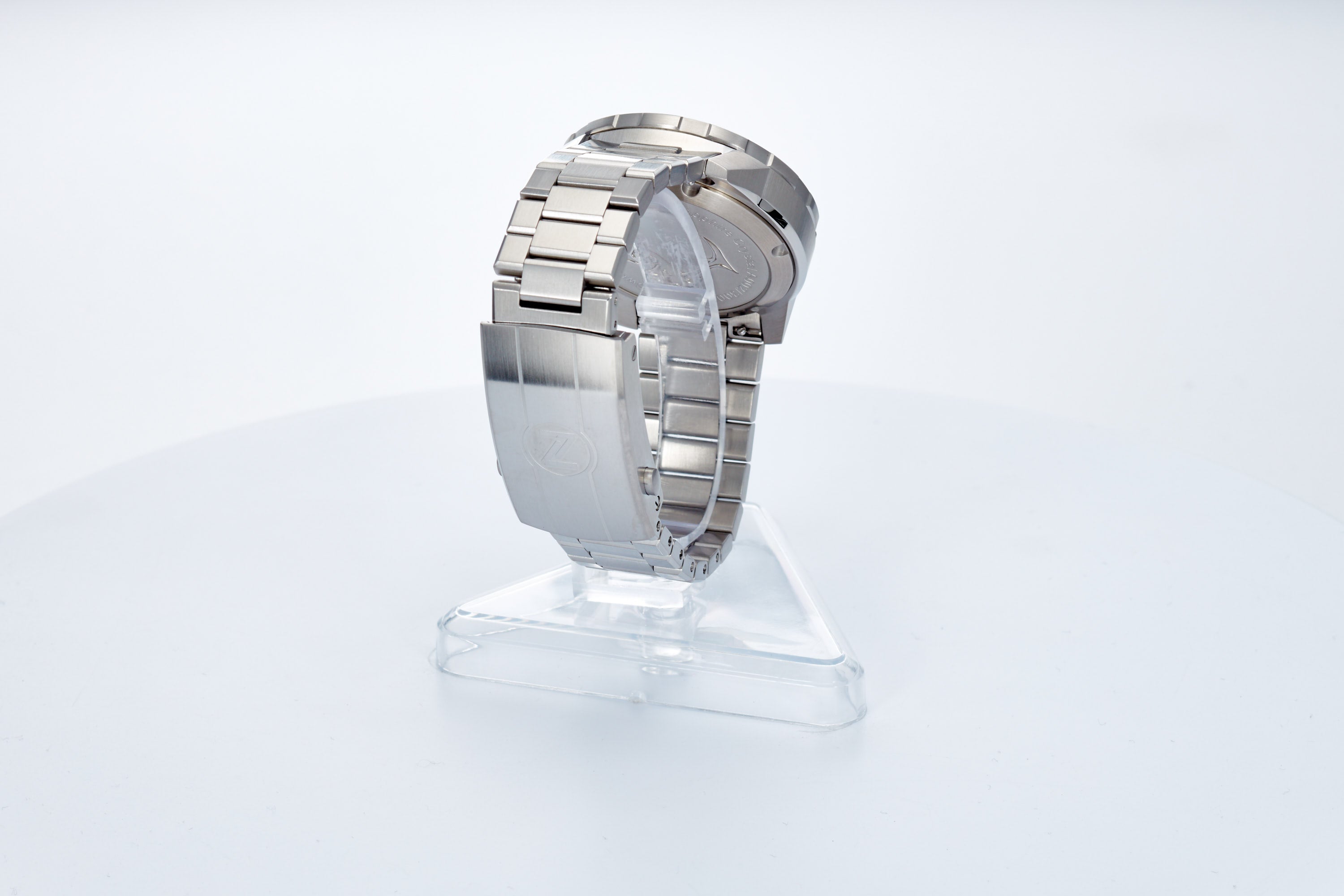 Meteorite dial and black sapphire bezel with light blue lumed hands and indices.