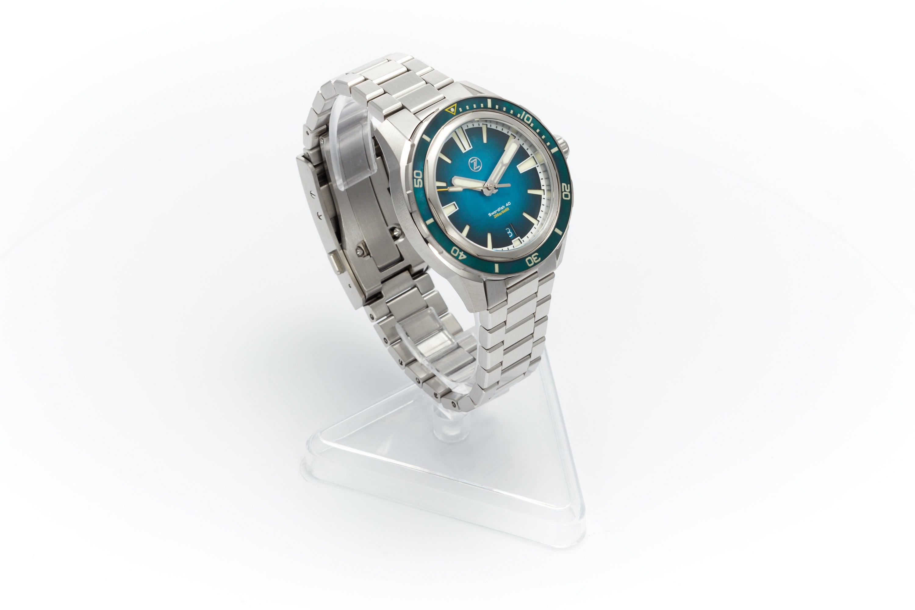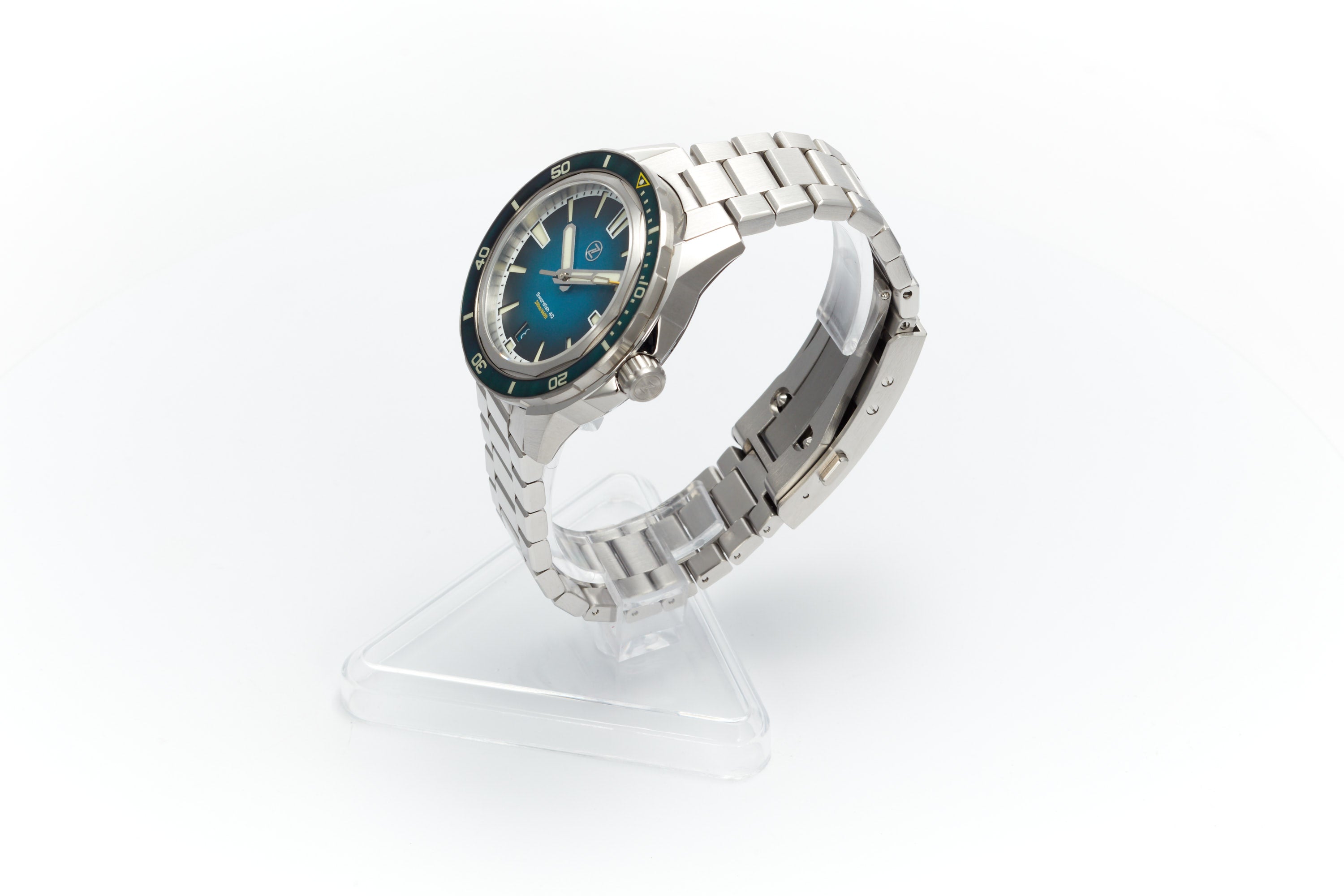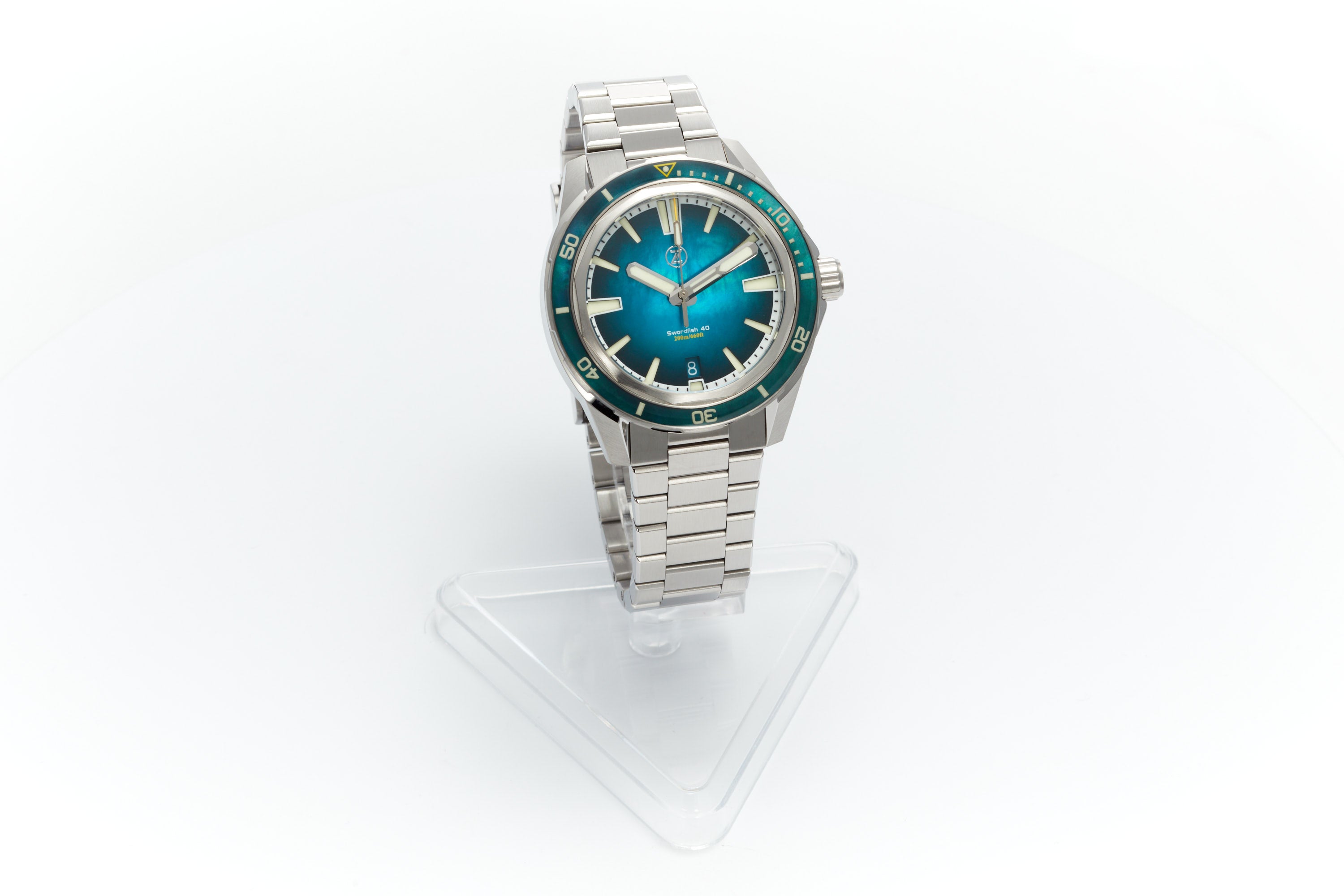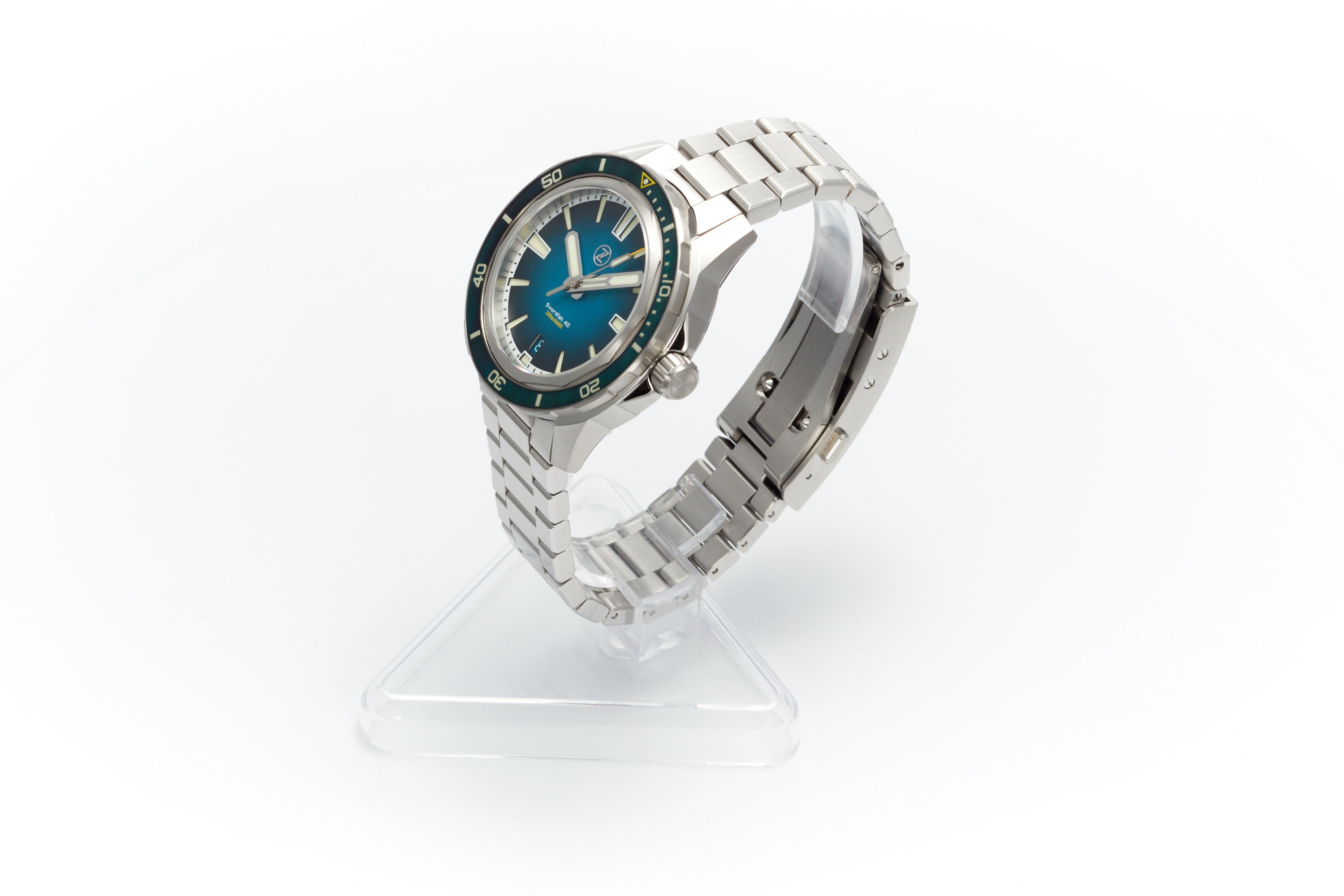 Fumé Teal Mother of Pearl dial and MOP bezel. Bezel epoxy coated for added protection.