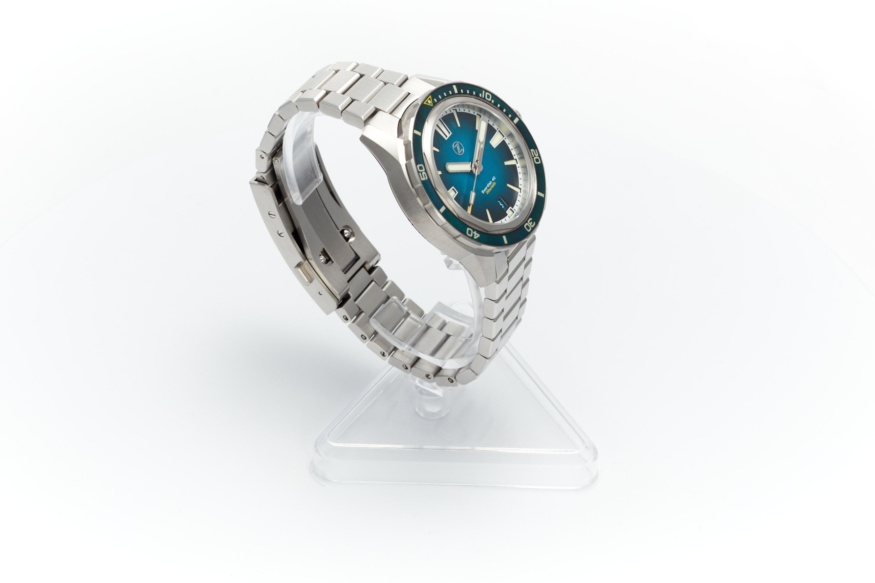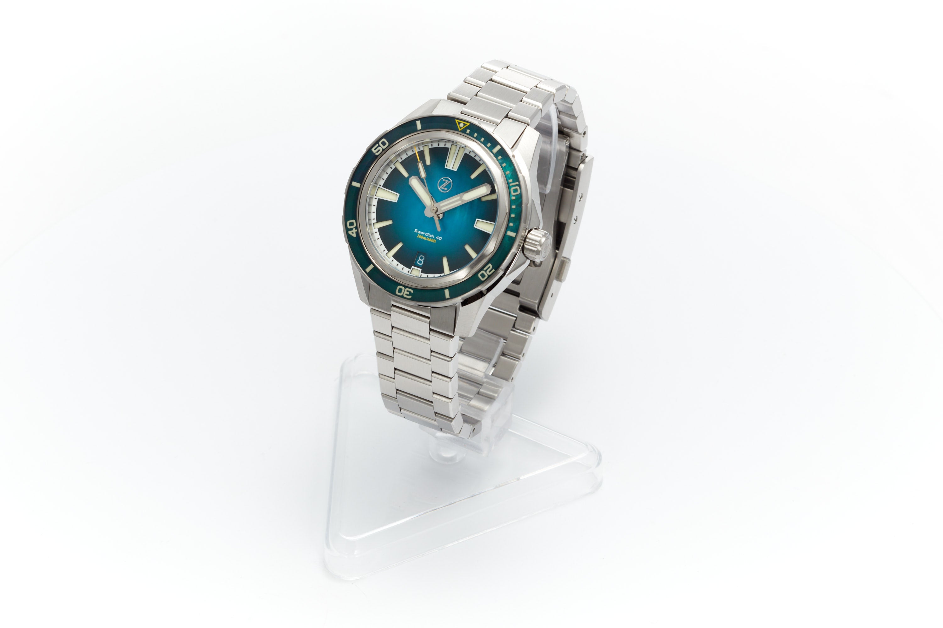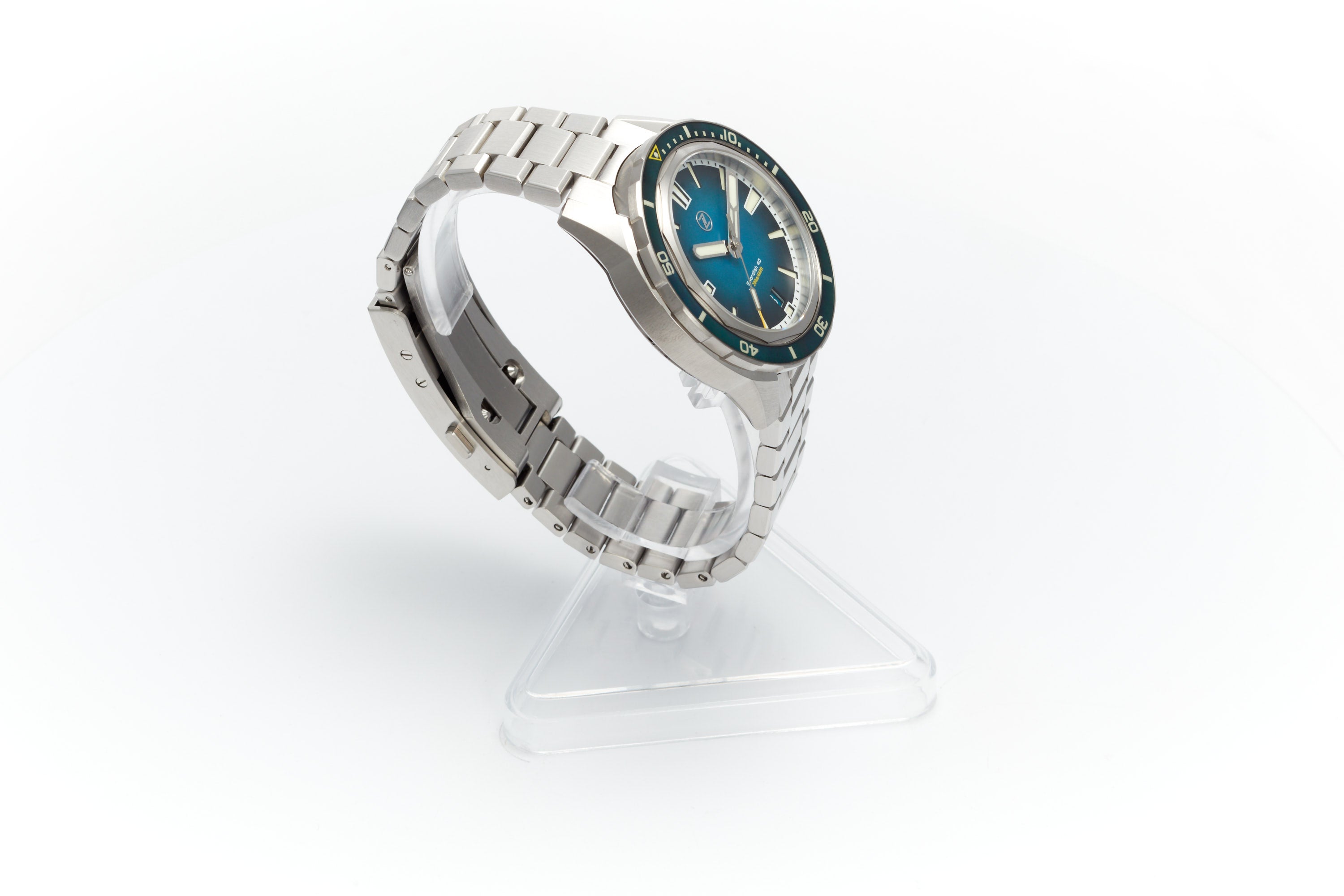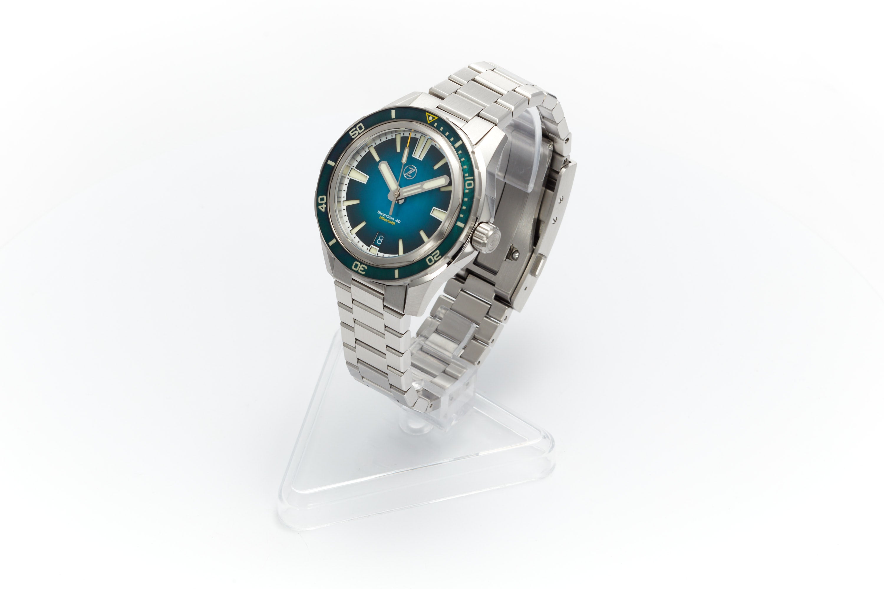 Fumé Teal Mother of Pearl dial and MOP bezel. Bezel epoxy coated for added protection.