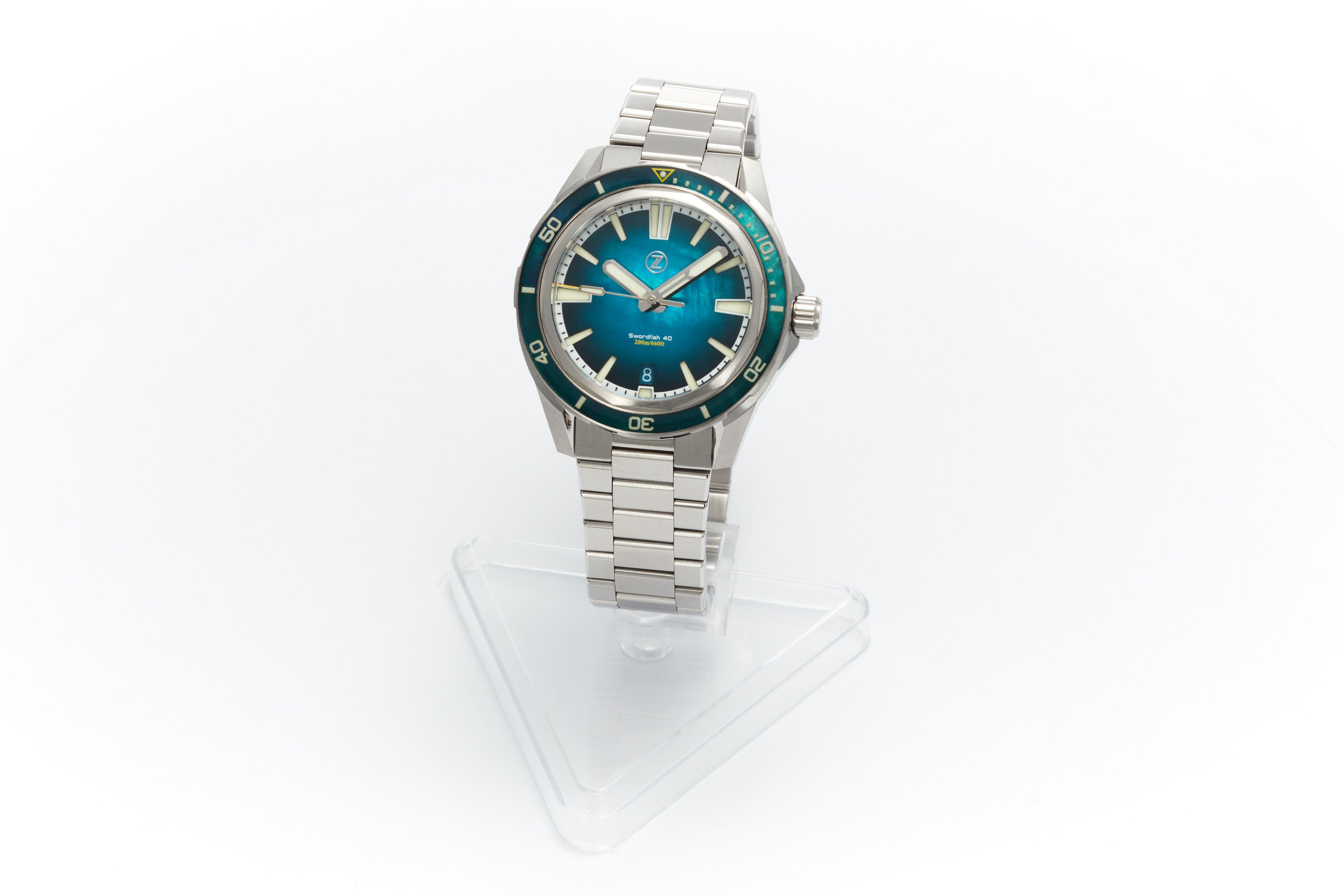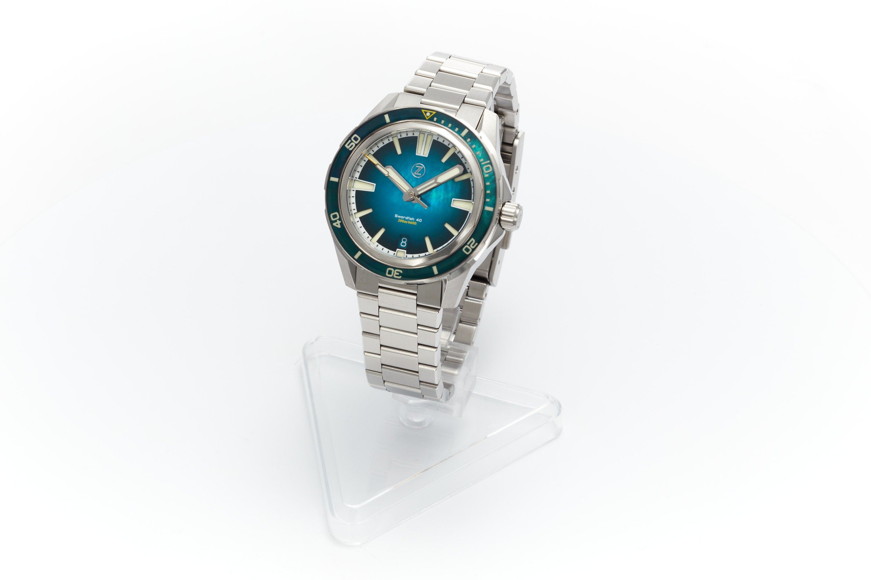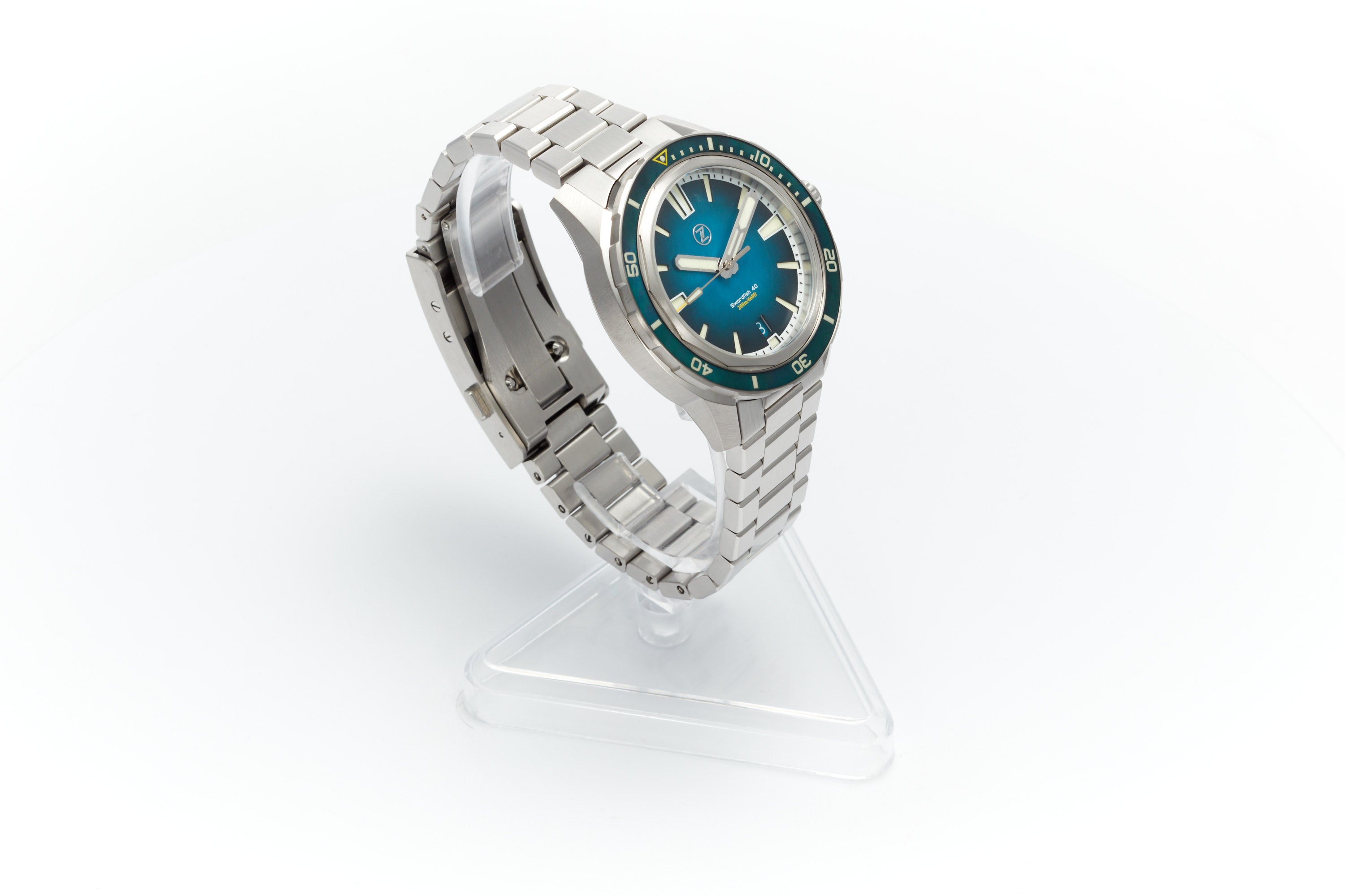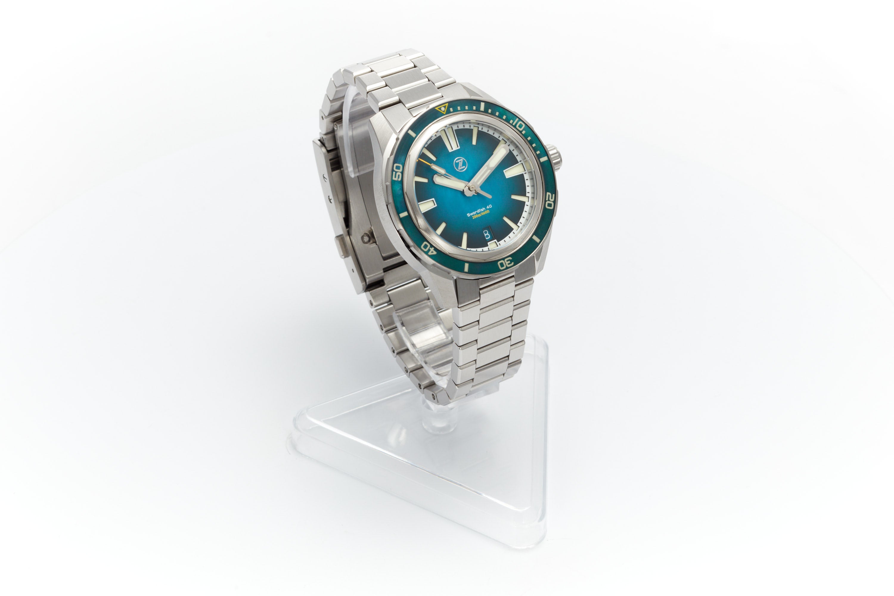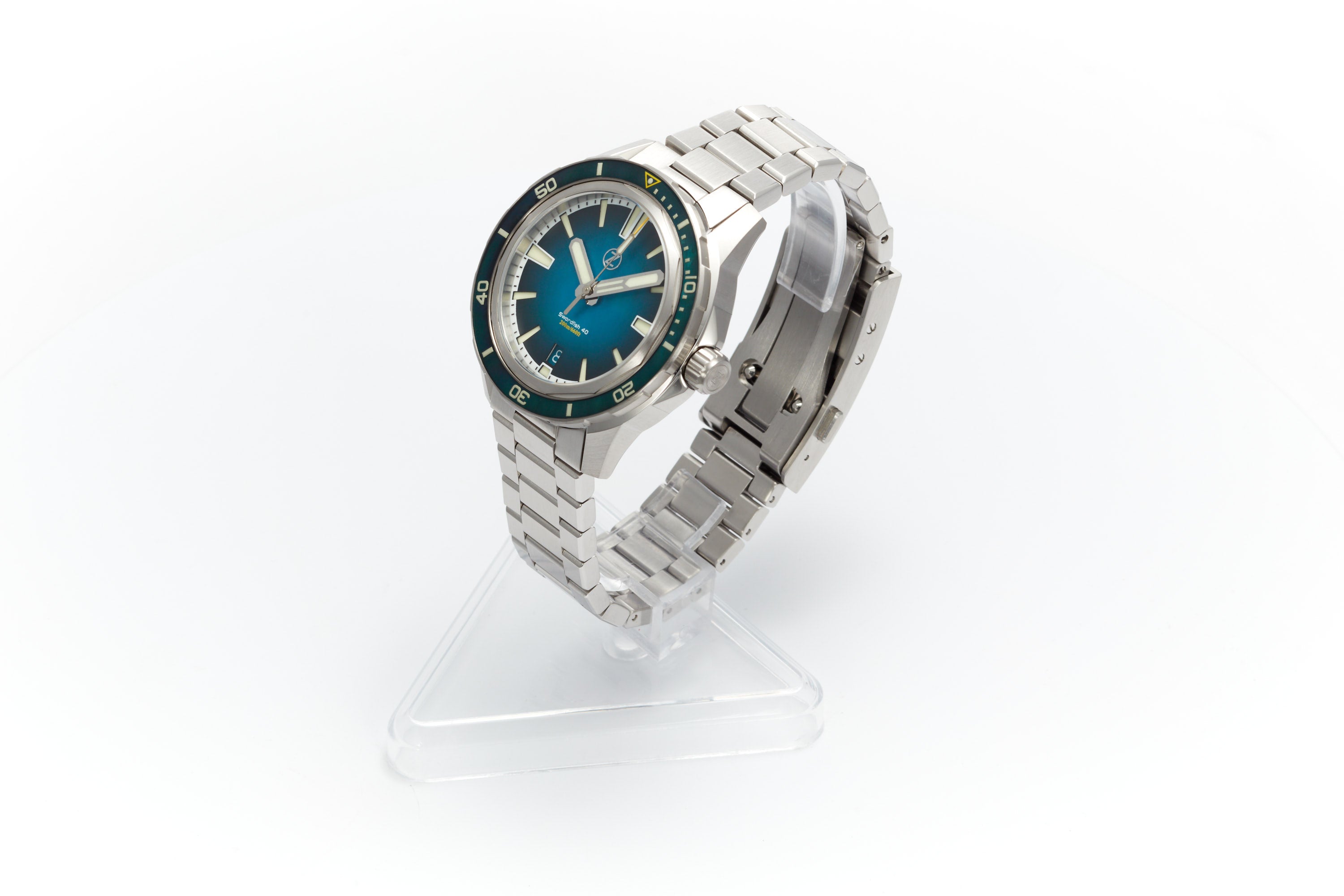 Fumé Teal Mother of Pearl dial and MOP bezel. Bezel epoxy coated for added protection.