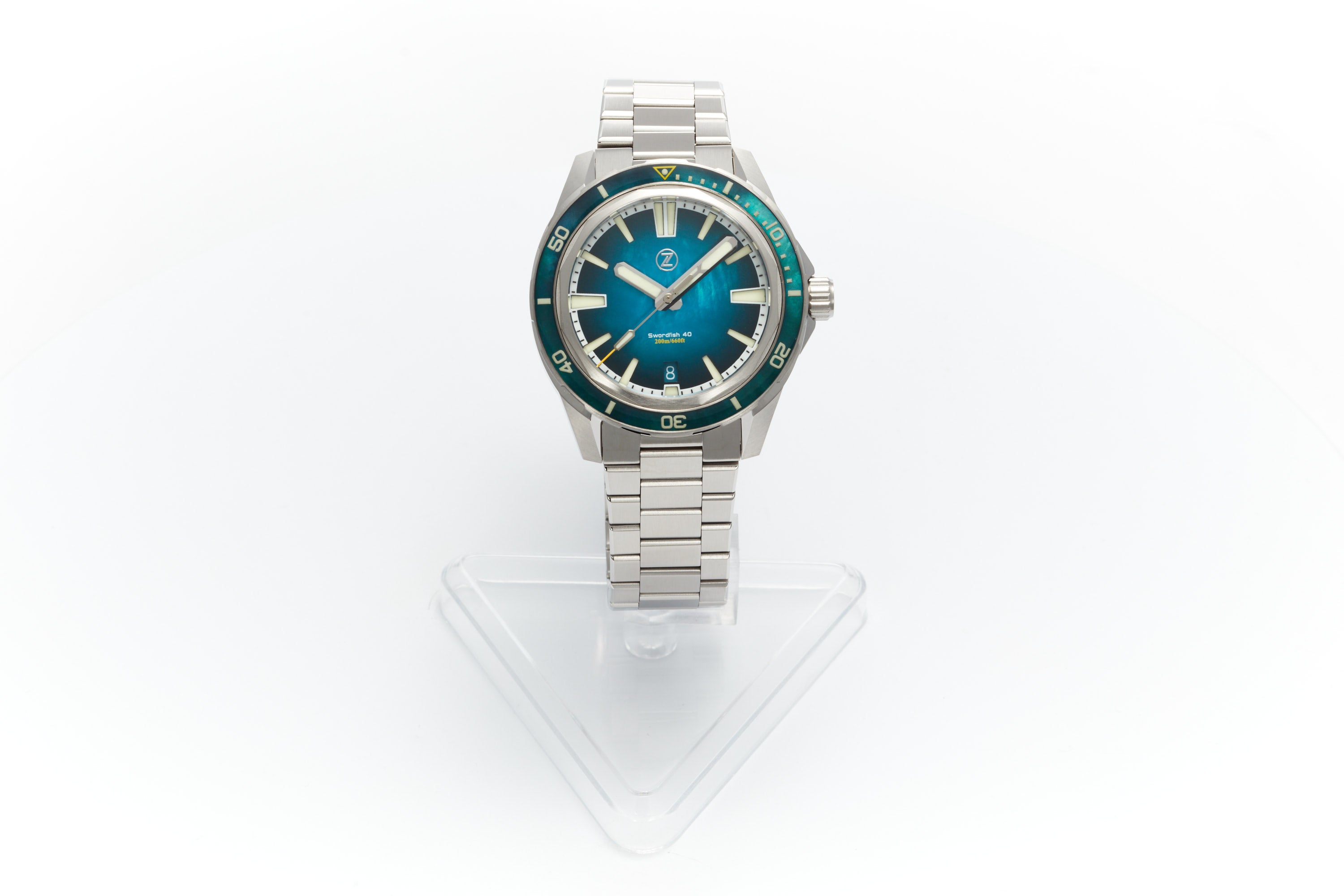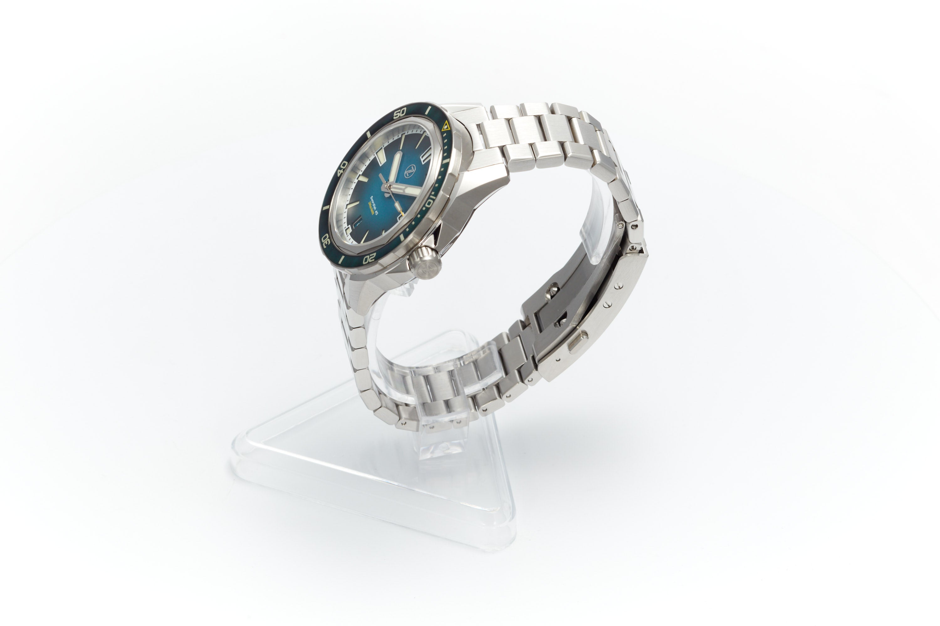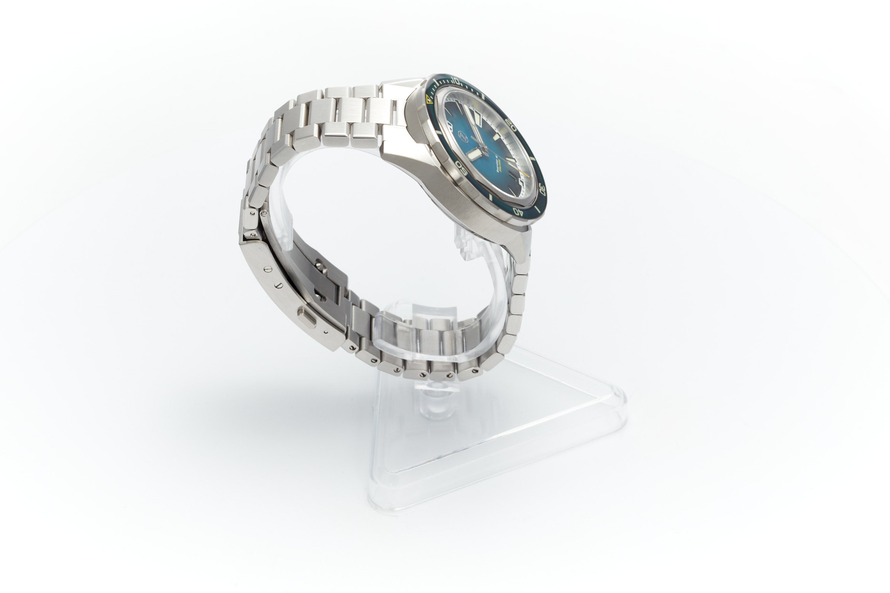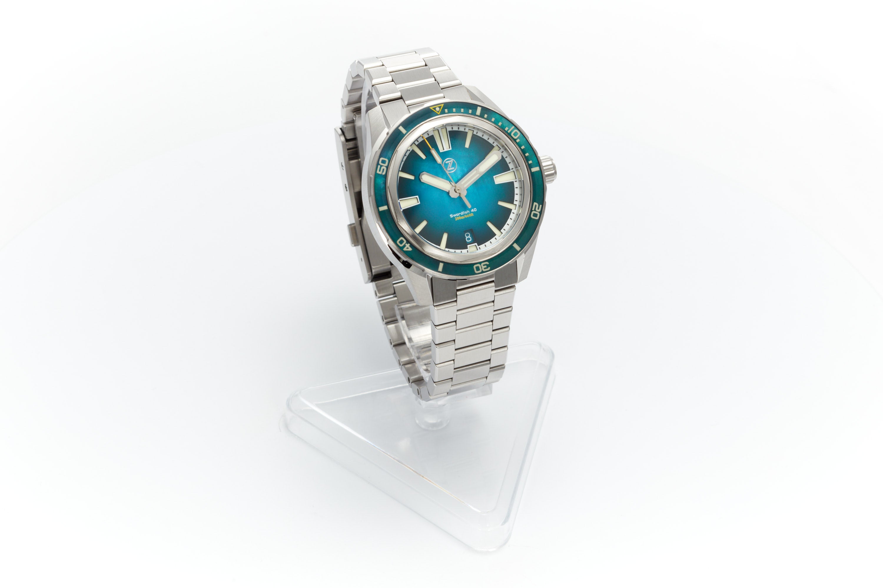 Fumé Teal Mother of Pearl dial and MOP bezel. Bezel epoxy coated for added protection.