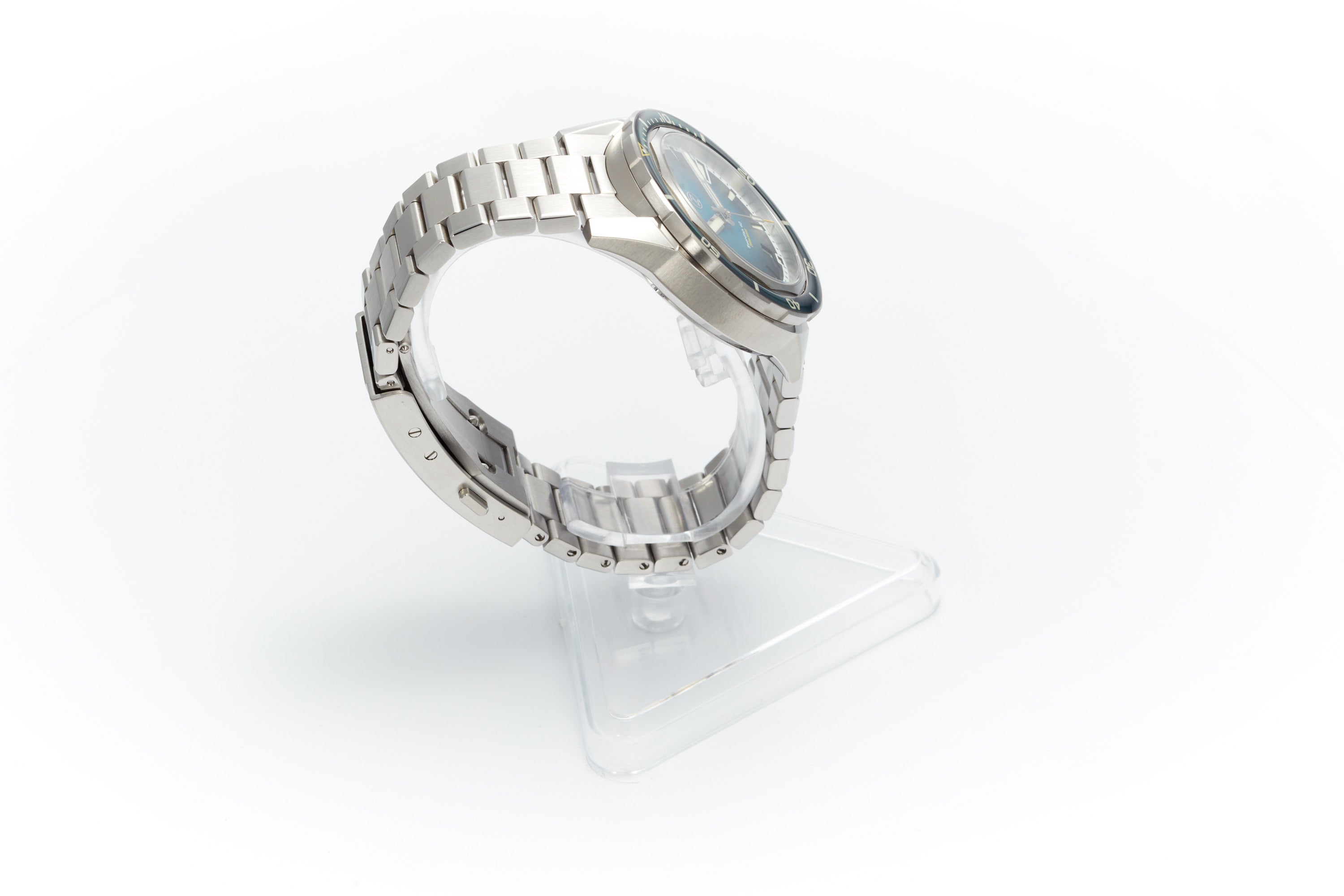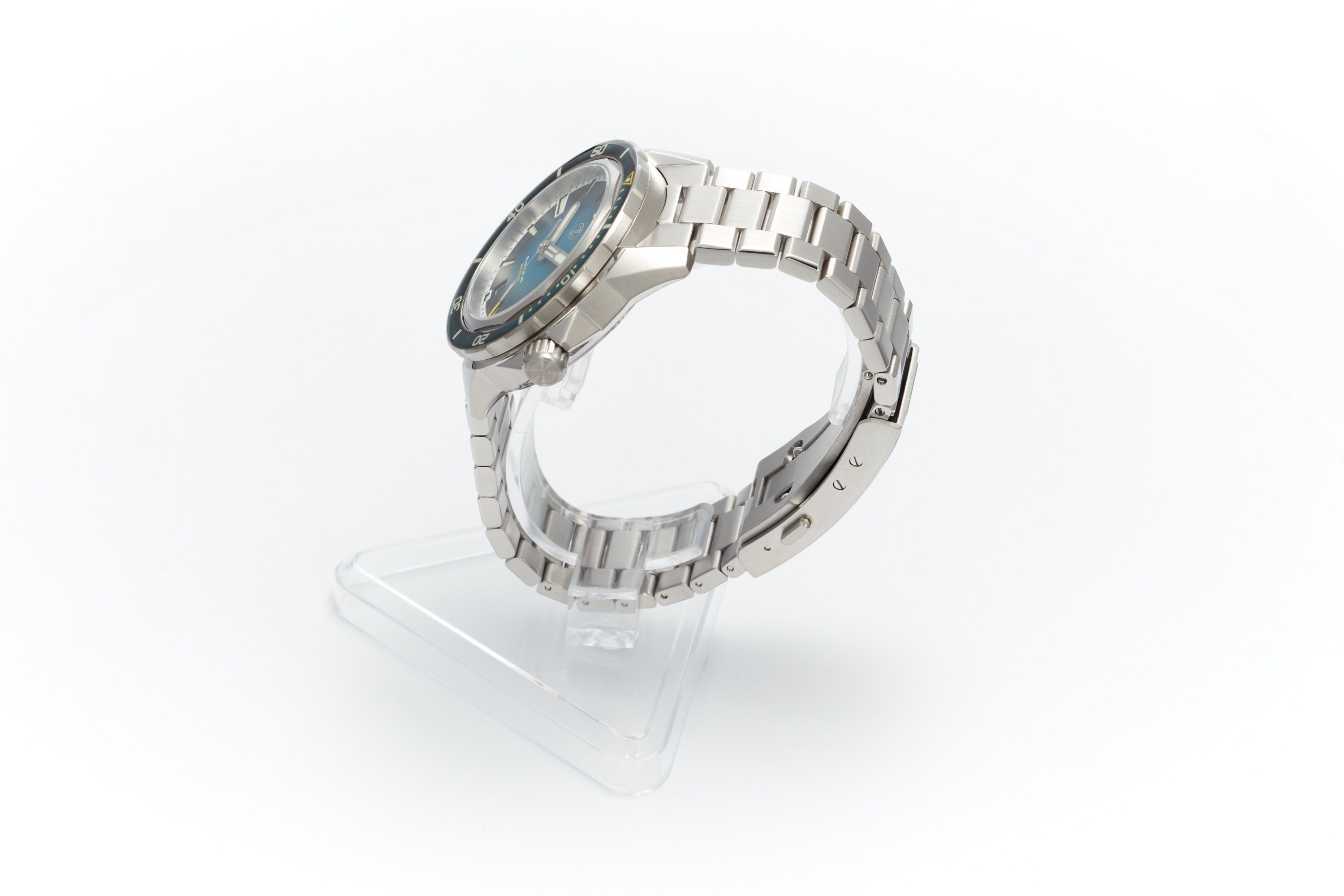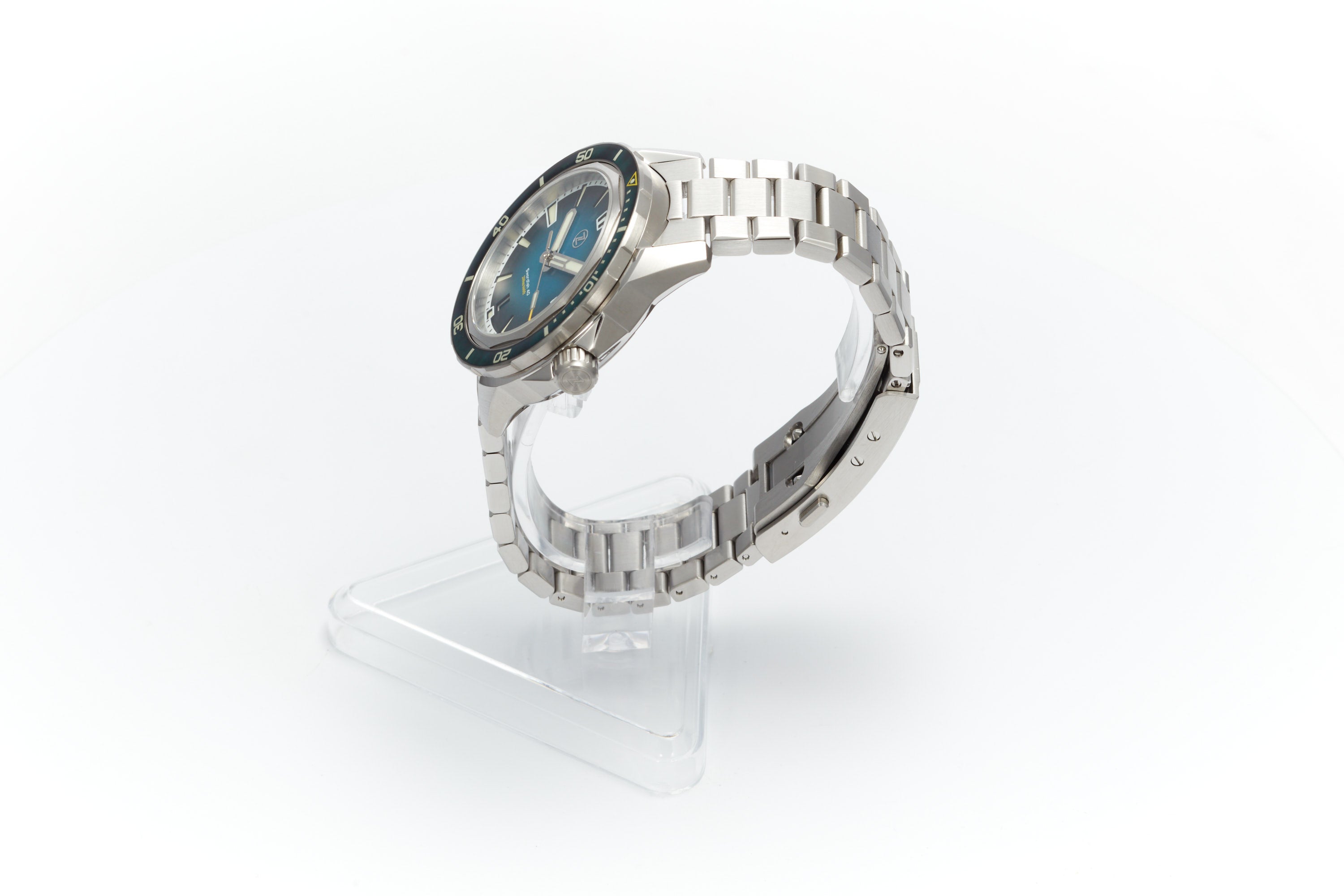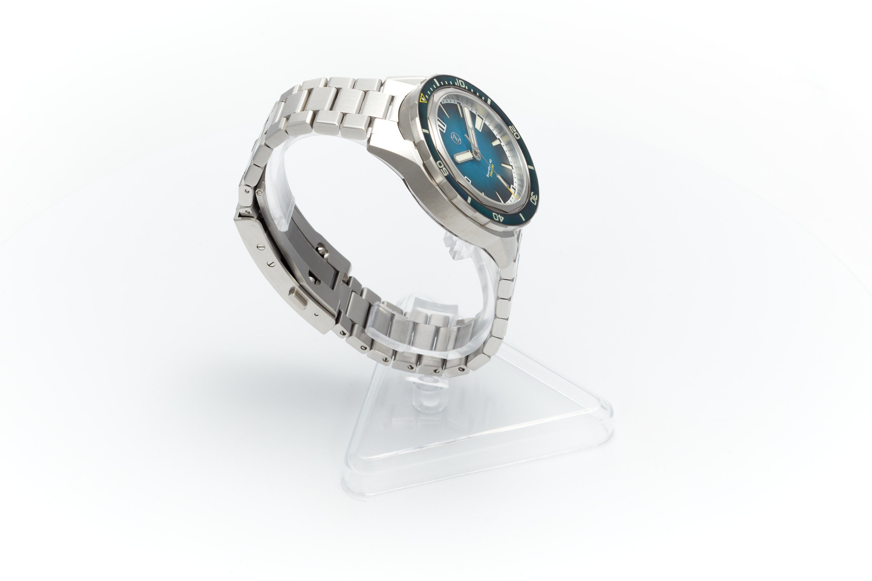 Fumé Teal Mother of Pearl dial and MOP bezel. Bezel epoxy coated for added protection.